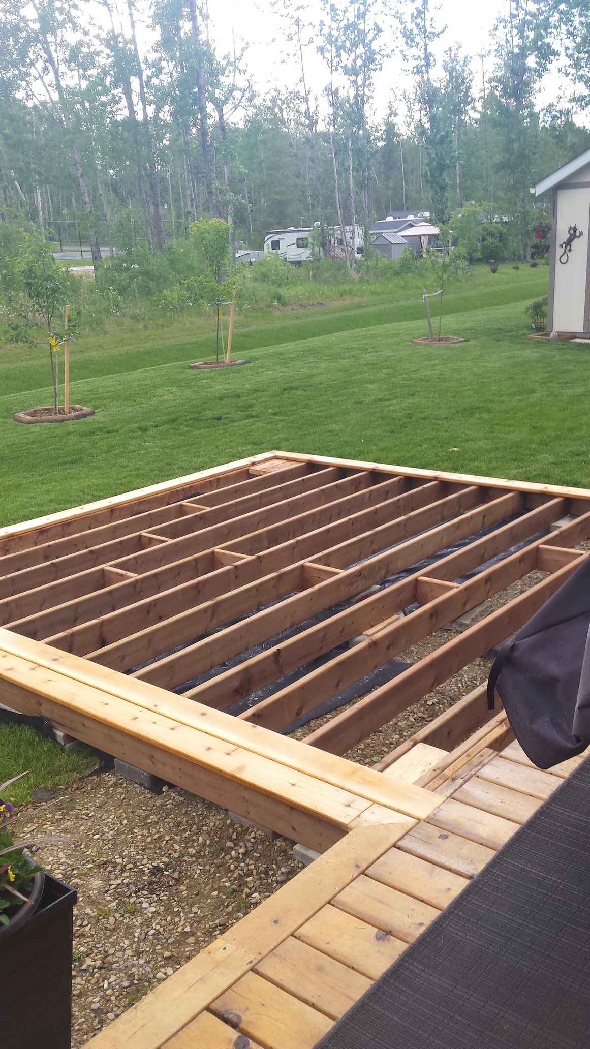 Fred & Terry had quite a bit done by the time I got there. We finished off squaring the deck. putting the stringers in and blocking. We got the picture frame done also so a very good start. Temperature was very nice and only a small army of mosquitos. The deck already looks great and adds a lot of appeal.