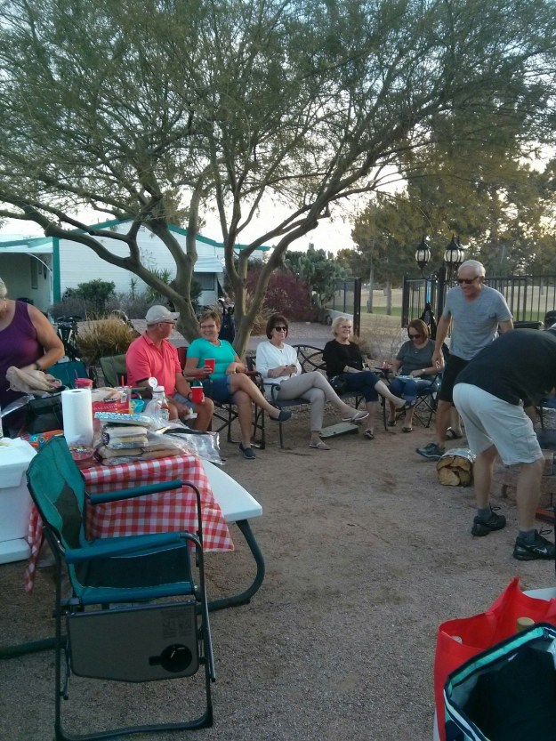 After golf as a group we decided to have a wiener roast at the park and have our wives join us. I had picked up the wieners and buns at Costco and cut up the onions, had grated cheese, diced some tomato’s for the dogs and picked up some relish, mustard and ketchup. Costco dogs are awesome tasting as were the seeded buns. We had 6 hotdogs out of the 40 left over. Pretty good eating. I picked up two bundles of wood from Tractor Supply to have clean burning wood. Brought the condiments and others brought chips, shrimp etc. We had four wiener sticks to use from our last picnic which turned very useful along with our checkered tablecloth we use for Santan Flats. I do have to say most dogs cooked looked a little carcinogenetic but tasted great. Fun night with campfire, warm air (18 degrees at 9pm) and people gathered around. We even had a boom box playing C & W plus Newfie music.