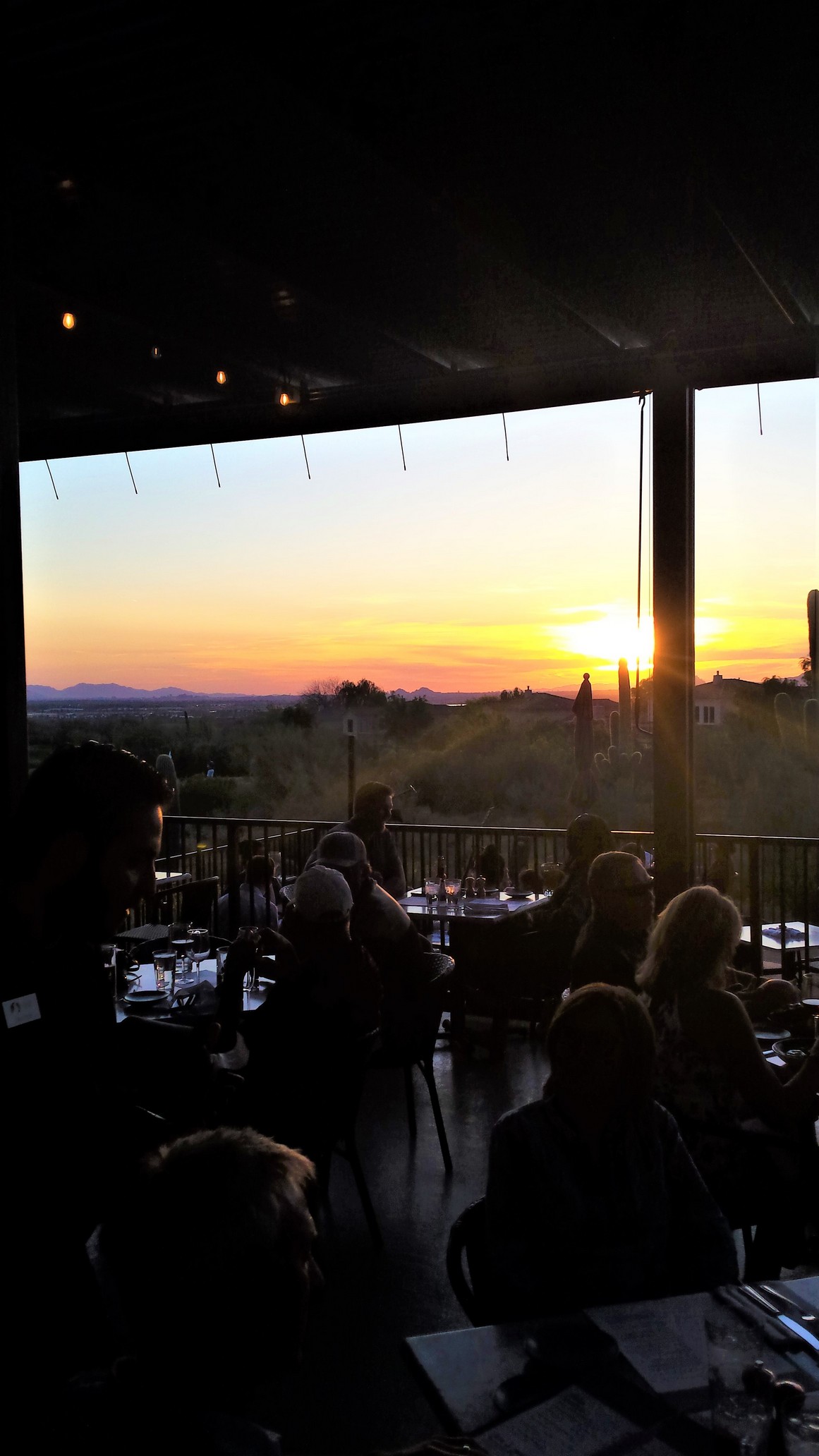 Pat & Bob are potentially leaving April 1st if all the paper work gets done so we took them out for supper. On a referral of sorts from Sandy our golfing partner I booked the patio at Las Sendas Golf Resort. Fred & Terry joined us and we headed out to the restaurant. All seven of us squeezed into the Enclave which was nice to have ever one together. Similar to my ordering of “Jugs” every time I order beer another word association went wrong when I indicated that I will pull up to the Bag Drop to allow the ladies out of the car. LOL