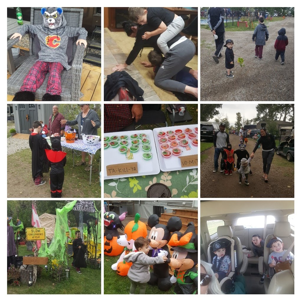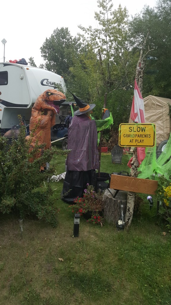 Saturday night was our Early Halloween Event. This absolutely is the best event ever. Some RV lots have spent hundreds and hundreds on decorating their lot. Mechanical, electronic, motion sensored costumes etc all out. We will build up our Halloween decorations over time. The streets were packed with kids and adults. Plenty of adults dressed up also. Scary displays at some lots. It is an adult and kids event with every second lot handing out Jello Shots. Jackie had 2 which for her was going overboard. I do know Tom our neighbors tasted like plenty of alcohol in each shot .LOL They were strong but very good.