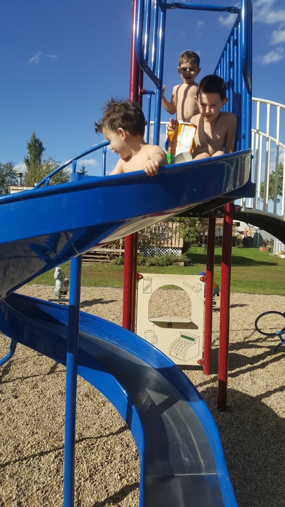 Many trips to the playground were taken. August makes friends very easily and had a blast playing on the slides and swings. We spent hours there with Jackson and him. My arms were tired from pushing the swing. August is funny. I was teaching him to pull on the chains and stretch out his legs but he found it a lot easier to say “Push me please.” LOL