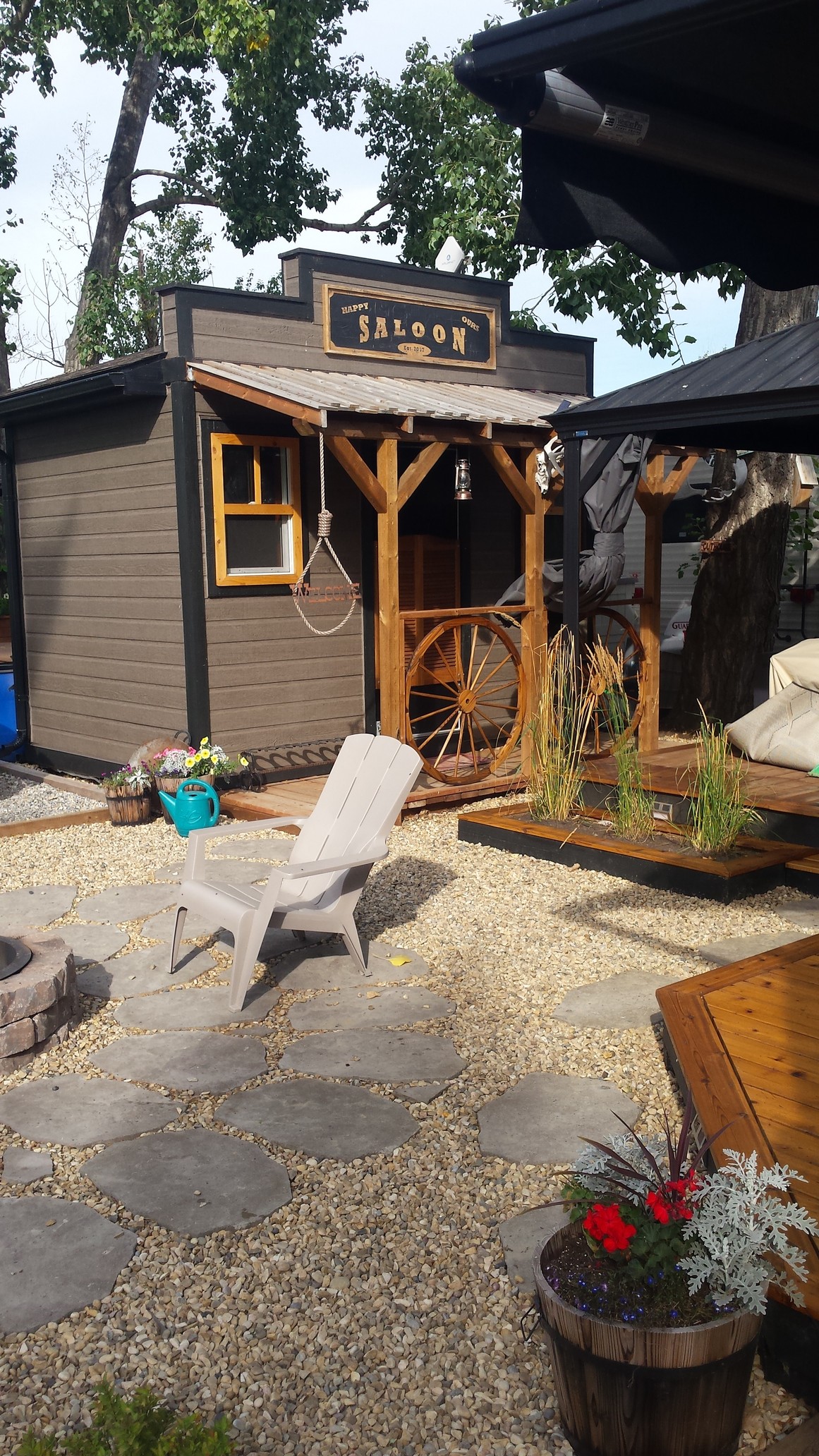 The first day we stayed out and enjoyed ourselves. I installed a wonderful picture taken of Jackie & I at Yellowstone National Park which is one of those taken with old western clothes in black & white. Looks great in the Saloon. I hung a couple of western coat hooks. Used my angle grinder to cutoff the 4 bolts holding on my swinging saloon doors. Stapled my electrical cords and used silicone to seal my LP fitting and GFI boxes. Cut the shooters s around our trees and a few little few up here and there.