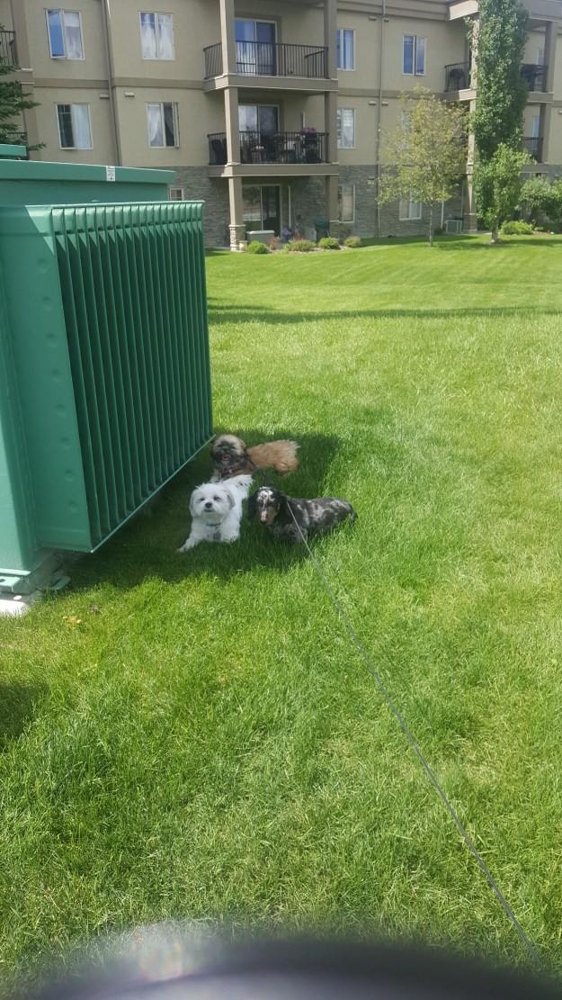 Daisy really enjoys her new friends from the building. George and Barkley are fun dog friends for her. Notice she is the only one with a leash. Embarrassing for her being the only dog with a helicopter Mom keeping her on her leash.