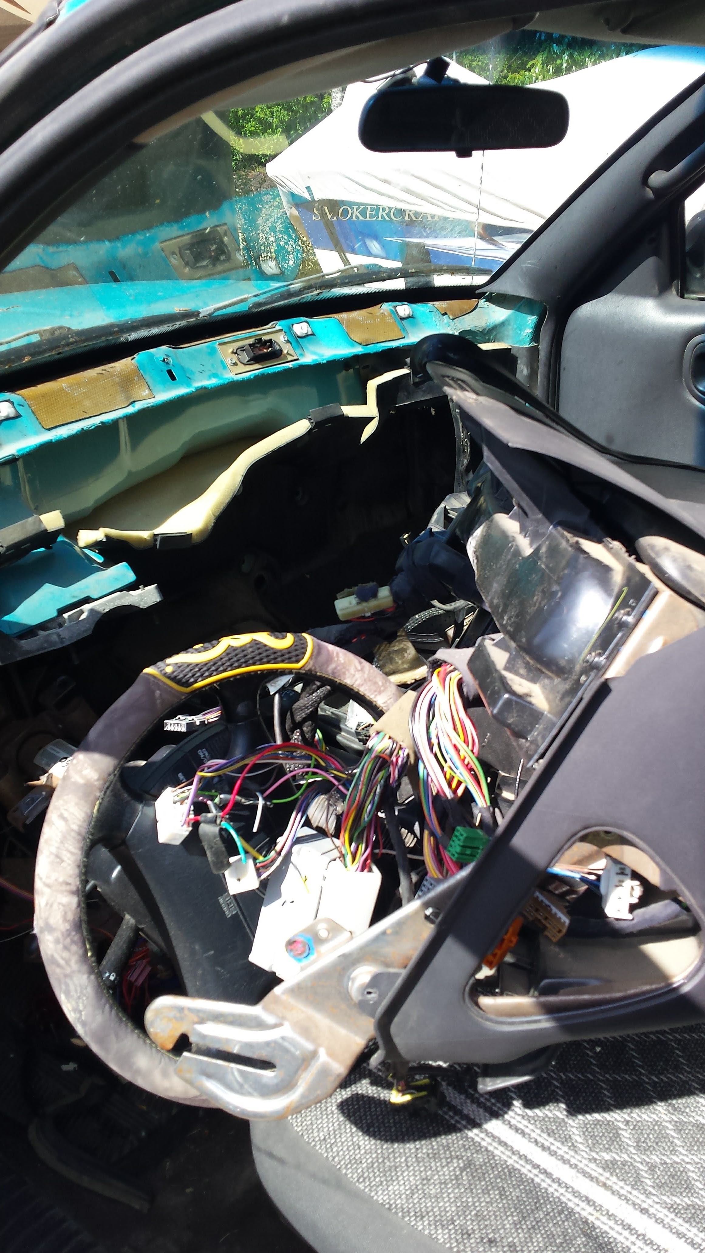The worst part over the years I am positive that people have made a mess of the wires with what looks the remnants of a remote starter and the addition of stereo. Electrical tape, poor connectors etc were used and the wires strung everywhere.The quality of work was dismal and made our job that much more difficult. That and the fact of having to remove the entire dash, drop the steering wheel and no wiggle room to see or find all of the connectors and plugs. Typically a dash should be plug and play but we had a lot of difficult things to deal with. Even the steering column main wiring harness wasn’t the typical plug and play. With the dash down I said to myself ,oh no this is much bigger job than anticipated. First time doing it also wasn’t the best. Getting out the HVAC box was difficult. Spacing, finding the bolts, disconnecting the a/c lines and the simple removal all complicated things. The a/c lines even with the special removal tool I bought was struggle.