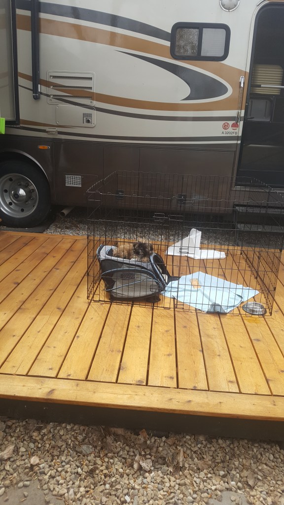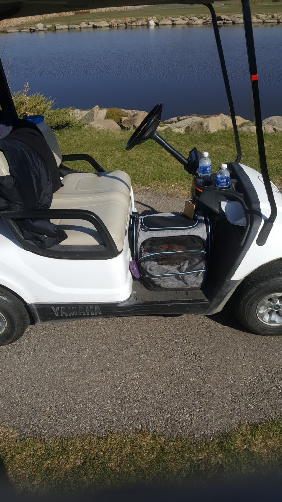 Daisy again golfed with us all day without any issues. She is an amazing little girl. Tomorrow after her shots we can let her on the ground which she will love and we will like as she can learn to pee outside.