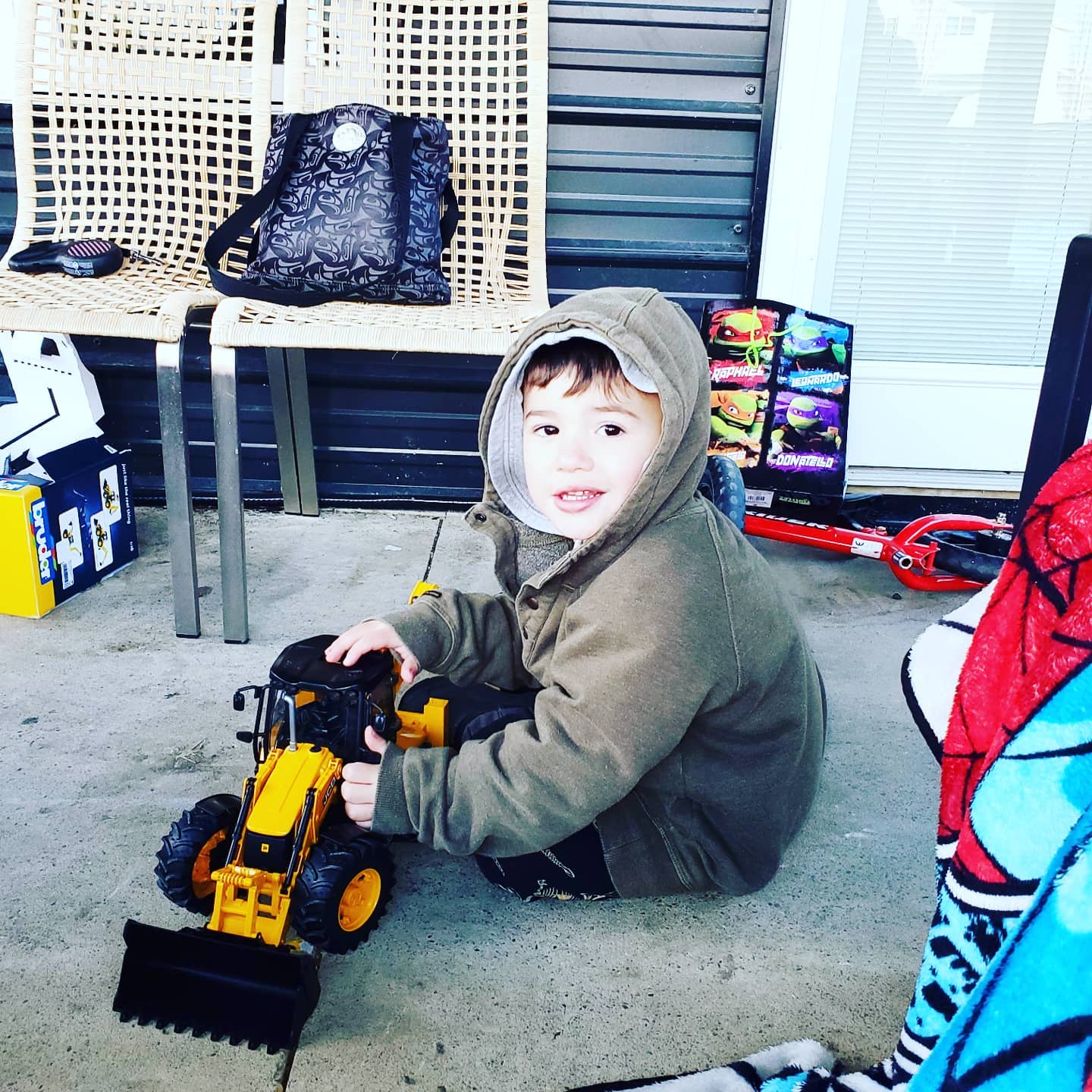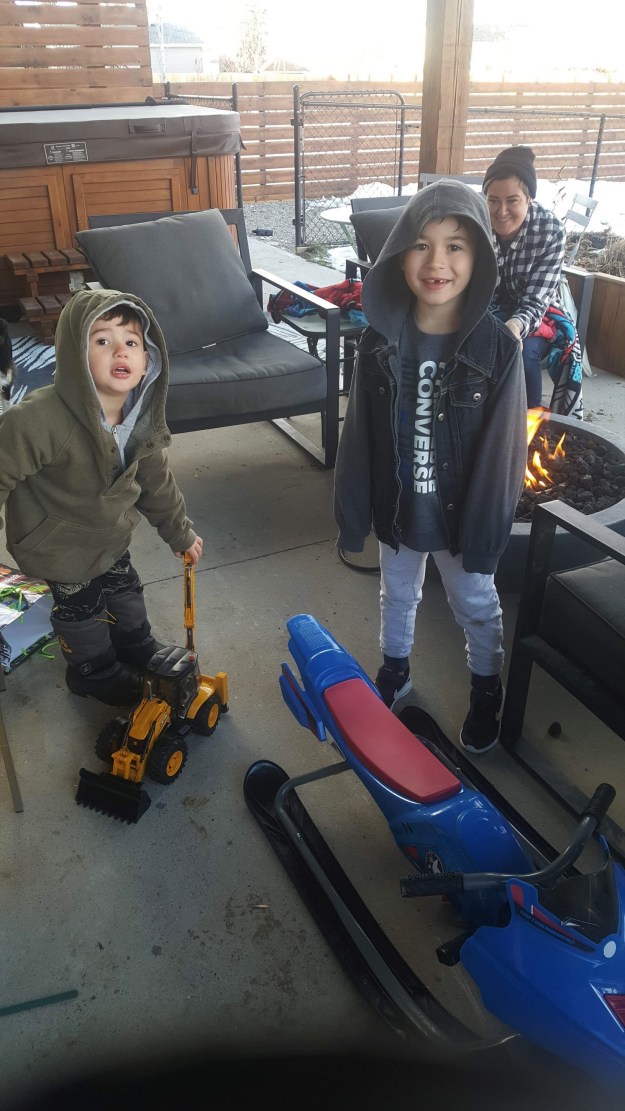 Jessica had the outside firepit on high and the boys outside when we arrived. It was only 1 above and a little breezy which made it feel cold. I had to keep warming my hands on the fire. It was nice with Atticus, August, Jess and us, outside keeping warm around the fire. Atticus really liked his “Digger” front end loader/backhoe and his soft blanket. He played with his grader the entire time we where there. Daisy had a blast continually bugging Olive, play biting, running, jumping and standing up on her. I am sure Olive liked it also but did have the odd bite to warn Daisy she was getting tired.
