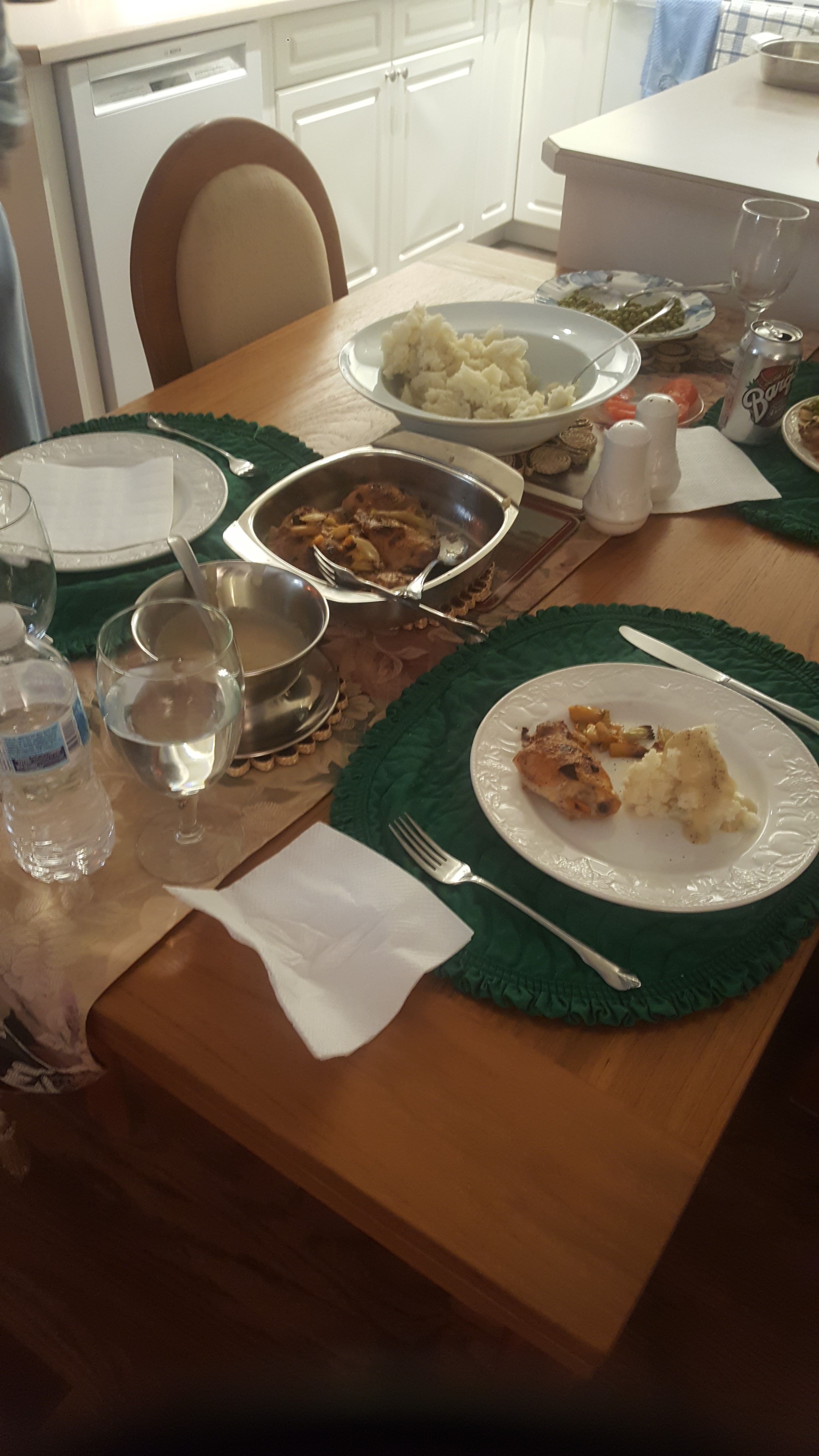 Audrey invited us over for supper which is nice as after working all day you are a little tired to cook. An excellent meal with chicken thighs and roasted veggies, mashed potatoes and peas. It was funny as Audrey was raised on mushy peas and Jackie pukes of the thought. I don’t mind them at all and they were good canned peas not the true British mushy ones. I will remember to Jackie some real mushy peas just to bug here. Wonderful meal. I really like roasted chicken with a crunchy crust. Very nice !