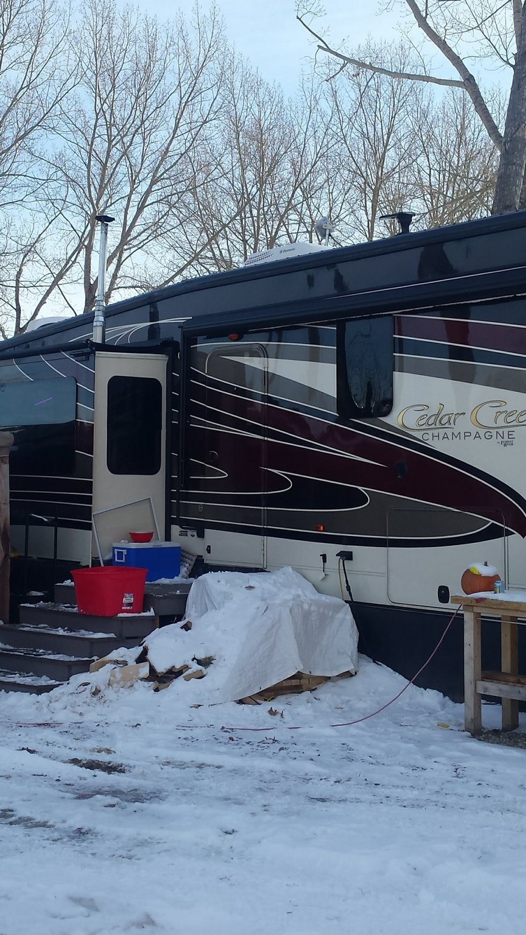 Now here is a Alberta REDNECK at work. This guy out at Oasis has a high end $130,000 dollar 5th wheel and due to covid and not going south he did what any good REDNECK would do. He cut a hole in the ceiling of the slide and installed a wood burning stove for heat.