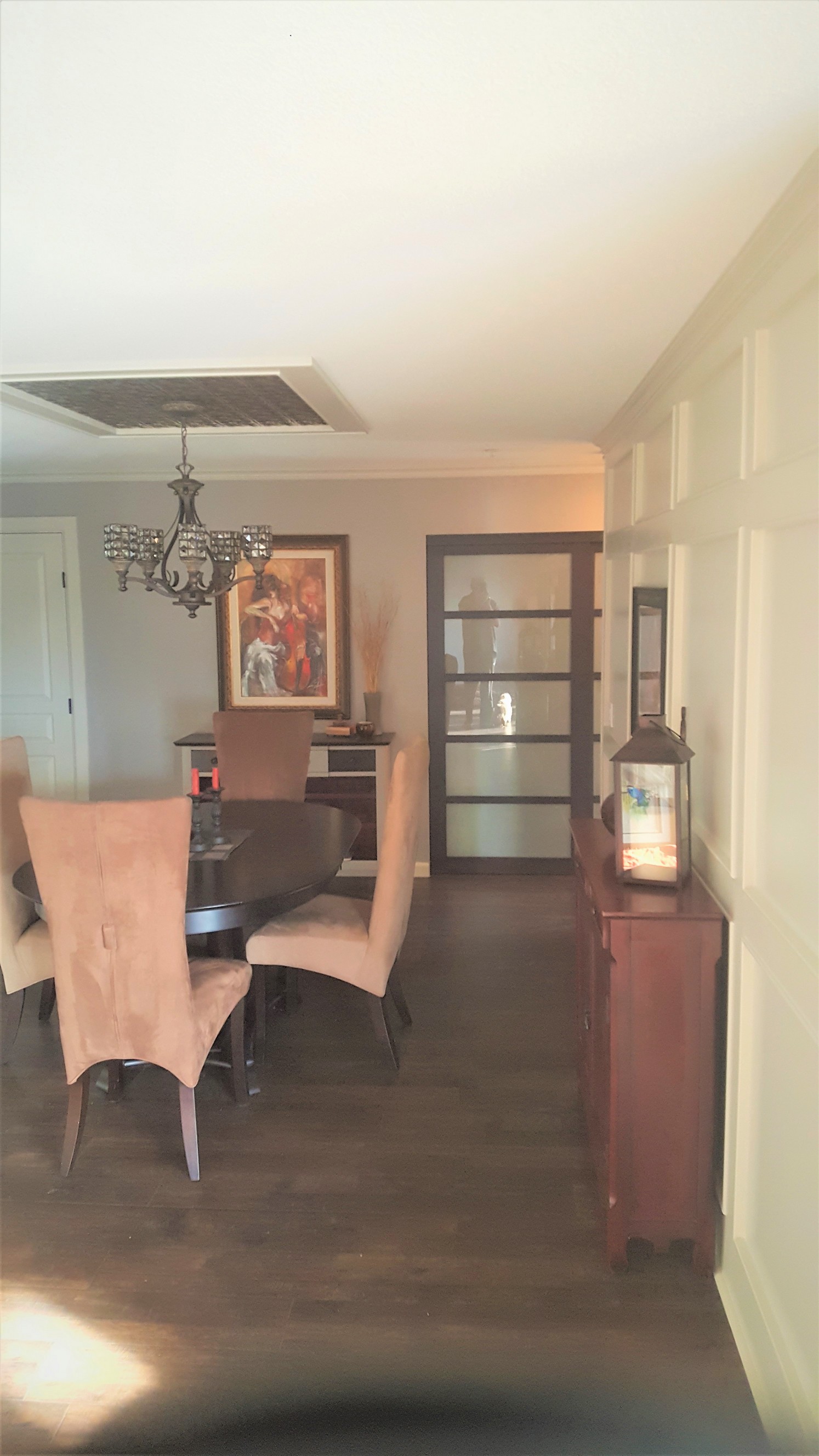 The dining room is complete with new chandelier globes, flooring, paint, closet door, picture hung and we are happy !