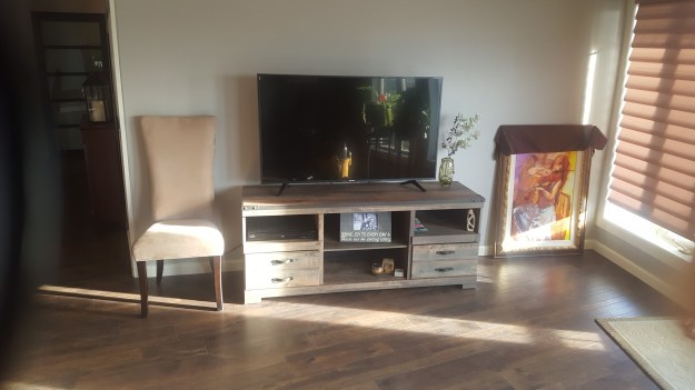 New TV stand, painted walls and trim, new floor and just waiting to hang pictures on the furniture arrival.
