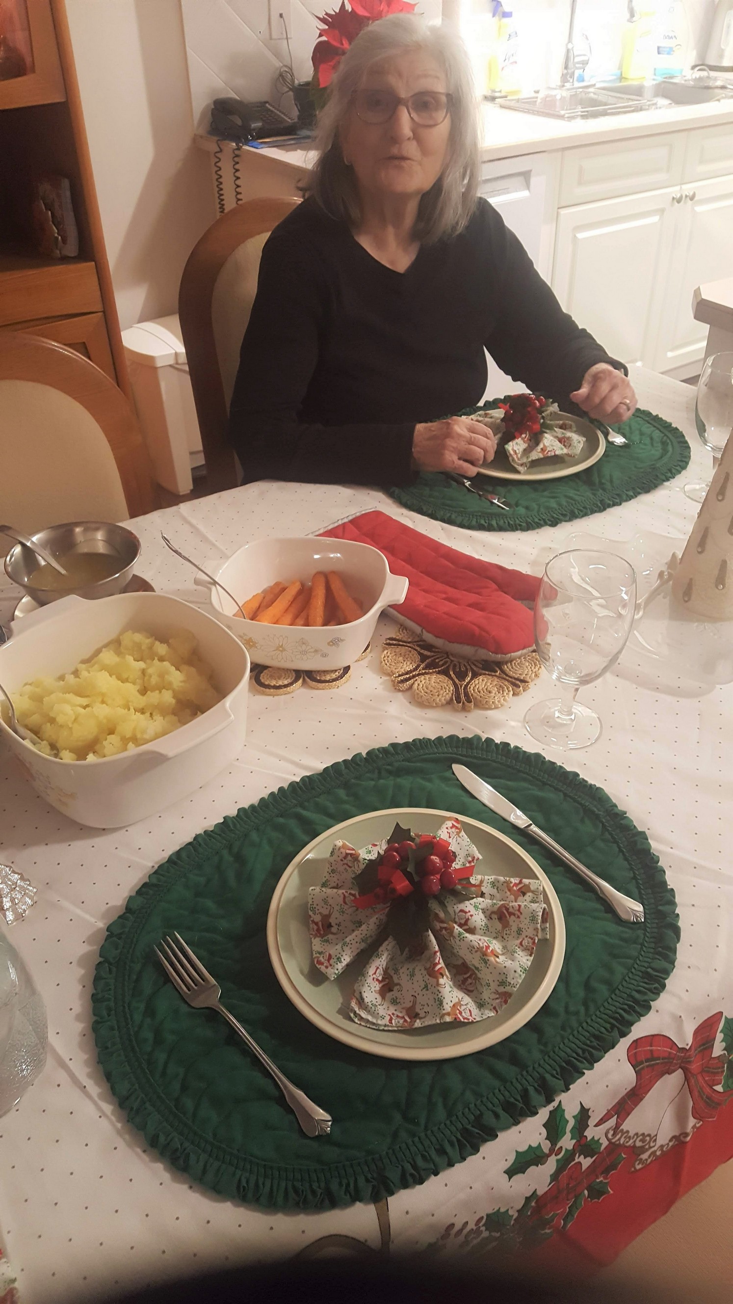 For this late afternoon’s Christmas supper we had: Turkey, Ham, dressing, peas, corn, carrots, mashed potatoes, mashed butternut squash, gravy and buns. To give the finer details on each as follows. The mashed butternut squash was roasted with butter and a brown sugar coating. The carrots were done as a brown sugar and honey glaze. The ham was a maple syrup glaze. The veggies were all standard as were the mashed potatoes. The buns were homemade by Mary and were amazing. A homemade pie and ice cream finished it off. Everything turned out just like I thought and if I have to say myself was very delicious. I didn’t want to use our blender for the squash to make it a puree so next time I will need to come up with a different idea on this. I love turkey suppers. The best. Even the chilled wine was exceptional but both Audrey and Jackie are party poopers in this regard.