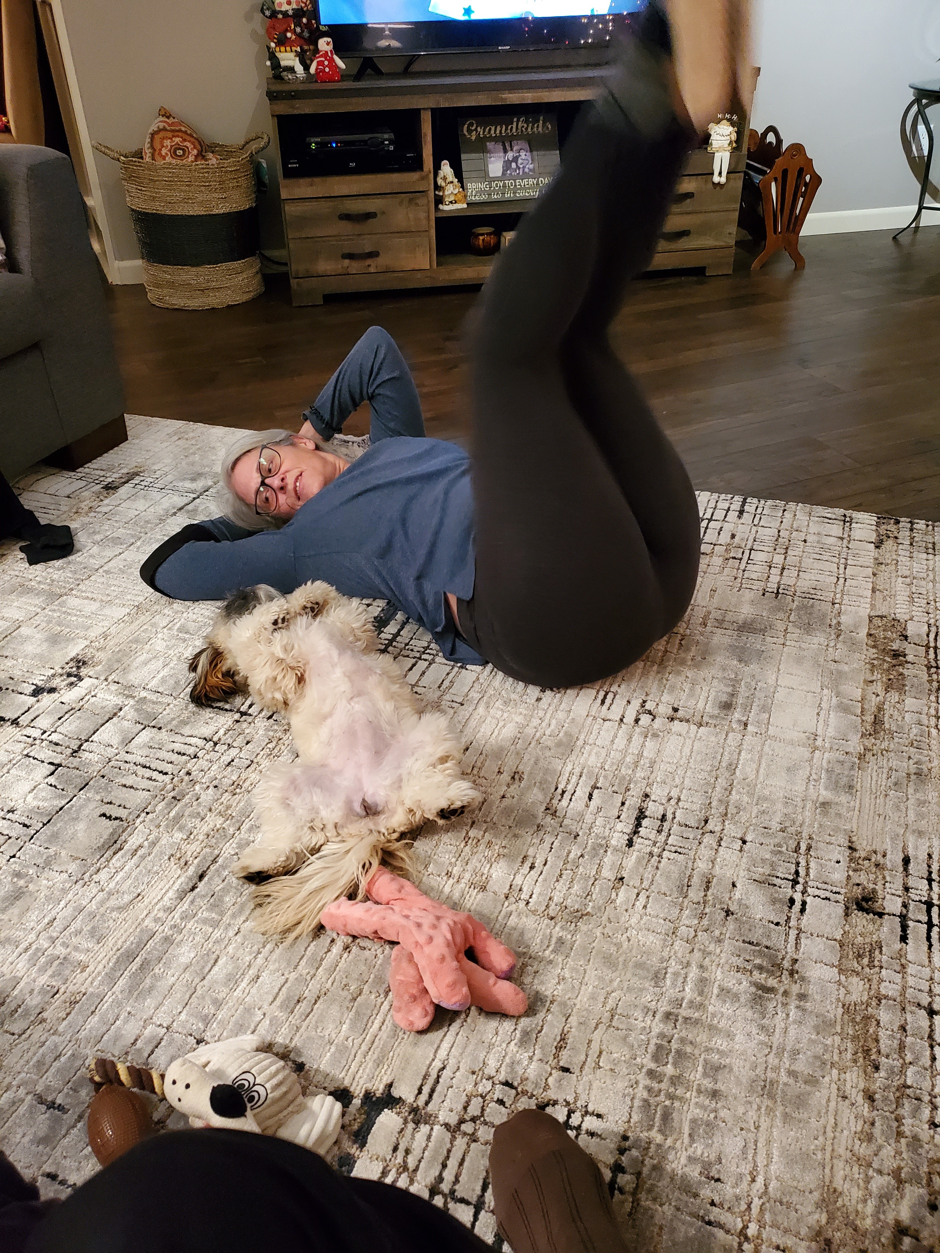 Daisy and I had a long walk today. Cooler but not cold but in the deep snow her paws froze up and I had to warm up her paws. This little dog will not leave me alone. She play bites my hands and feet all day.