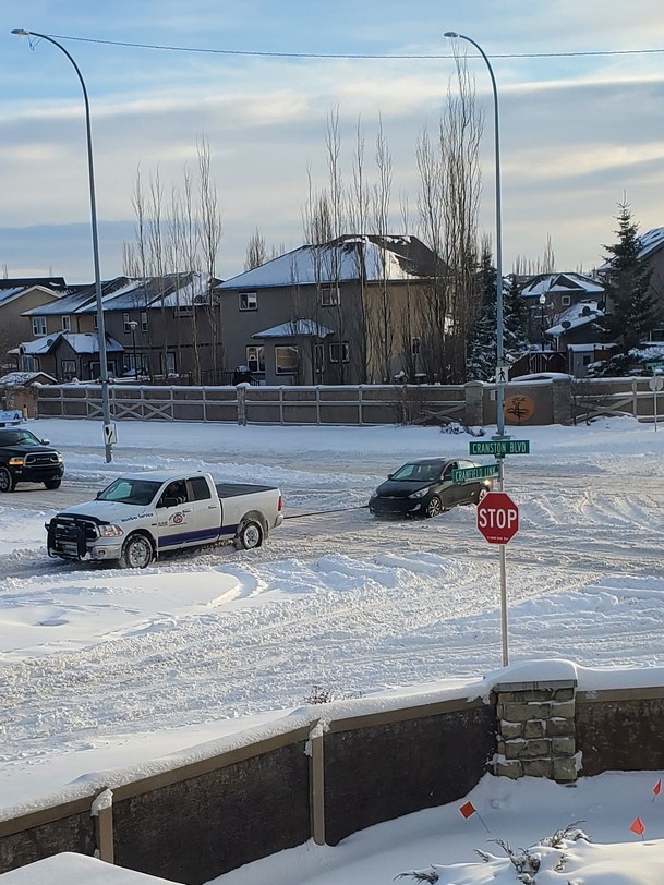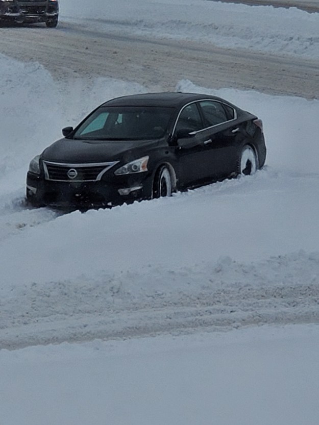 Well we had Dumb for the first car to get stuck now we have Dumber 2 . If you get stuck in the middle of the road with just a little pile of snow you shouldn’t have a license or perhaps instead of driving a Toy buy a vehicle made for Canada. I guess again he never heard of a gas pedal. Plow thru it, don’t gently wait to be high centered.