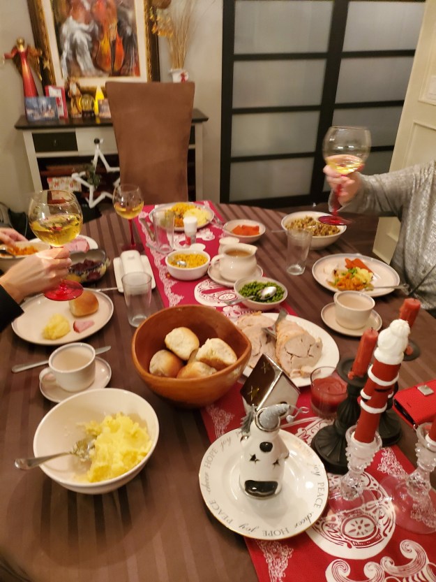 We decided to have our turkey dinner later in the afternoon so I didn’t have to start cooking until noon or so. Nowhere to go or no rush so pretty easy this year. Plus the fact three people versus 15 or so is a lot easier.
