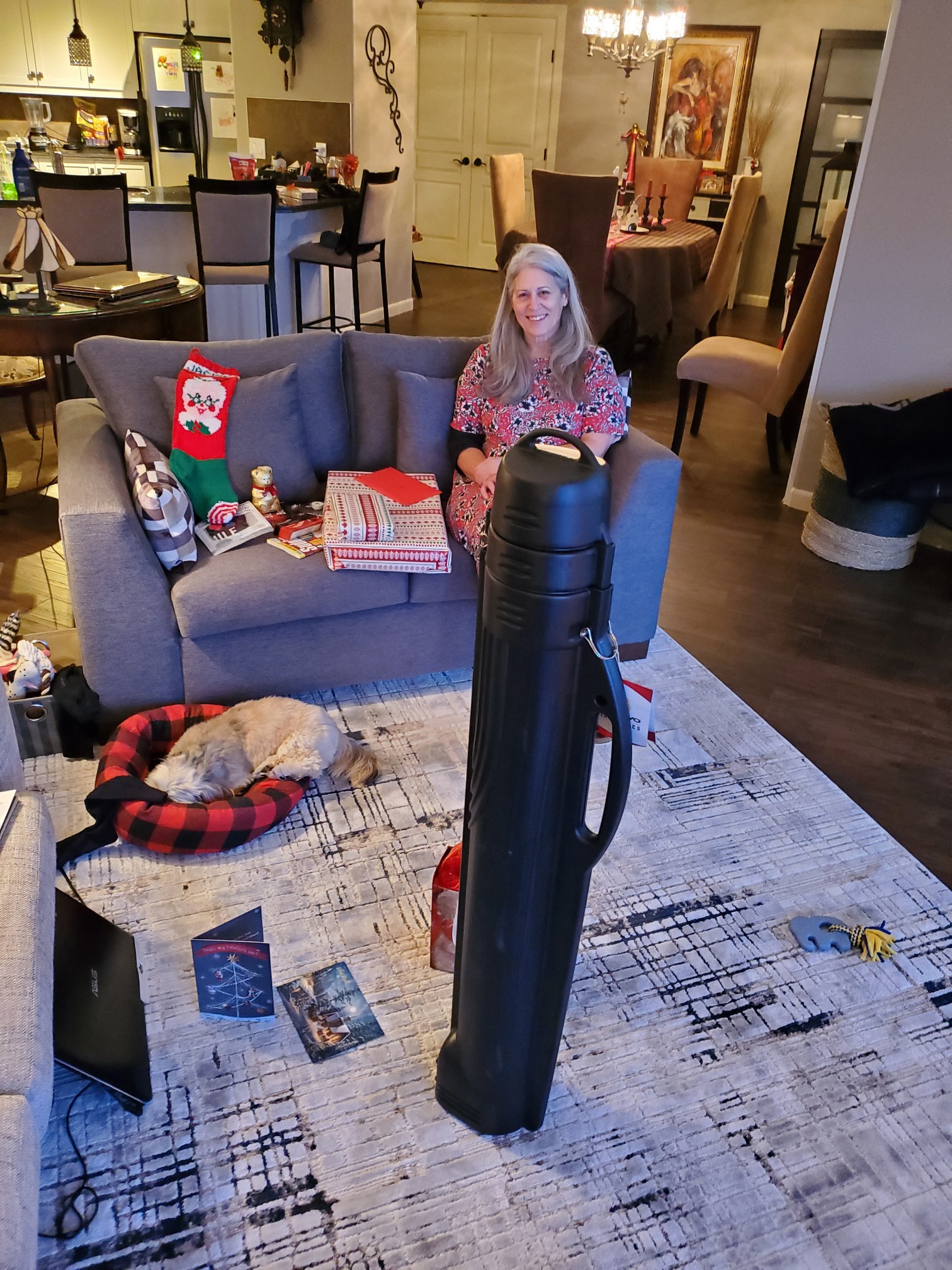 Daisy enjoying her Christmas treats, my new fishing case in the front and Jackie about to open her gifts