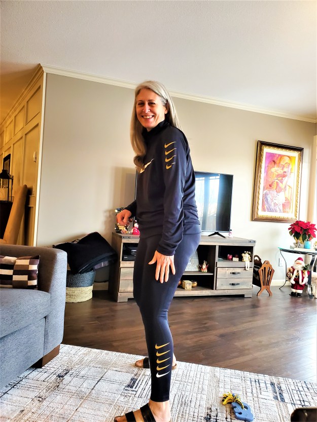 Jackie all dressed up as a Nike girl. I would say in 40 years of being married I have never bought the. wrong size. Nike again all fit perfectly and she looked great !!