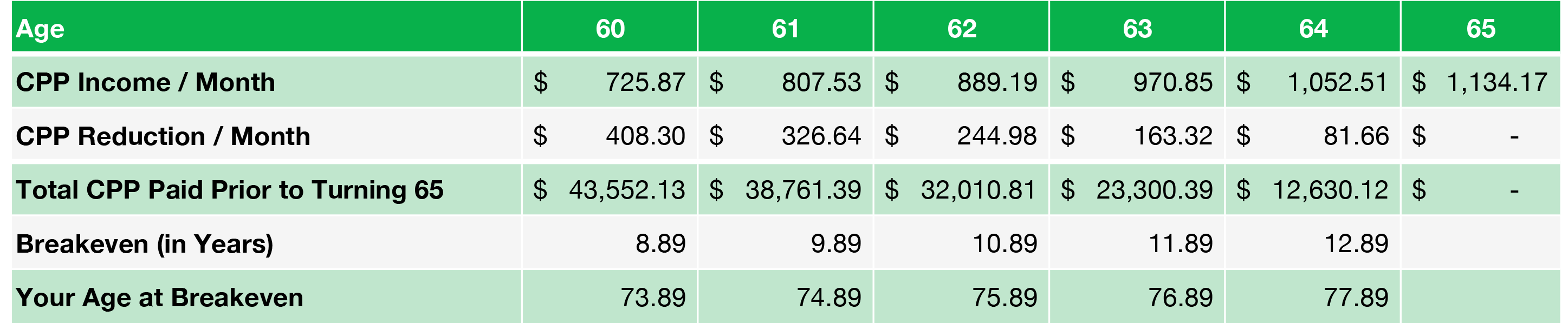 The above chart shows the maximum optimization of the CPP payouts. Curiously at age 65 it never is the max. If you took the difference between the 118K and 153K at age 60 and 70 and invested it yourself in TFSA you would be miles ahead. Without interest even you are ahead.