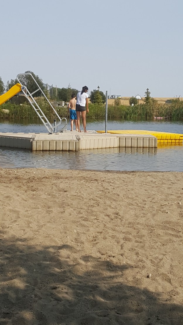 Saturday was another hot one being over 30 late in the evening. Victoria and Jackson came out to stay the night and enjoy the events. The pool with it’s limit of people was fully booked so we kept busy with games and the pond. Jackson loves the pond and even convinced his Mom to get into the water and jump on the floats. He even wanted to be buried in the sand again.
