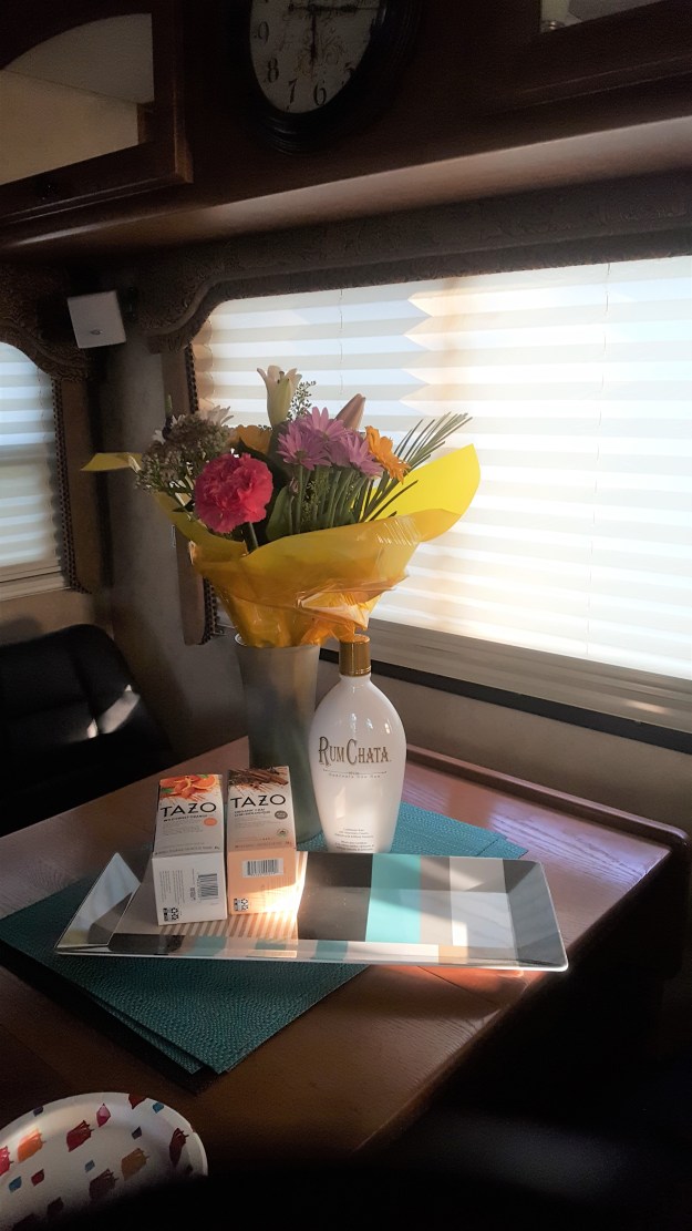 I worked out at the lot for about 8 hours today. I enjoy out there. Dreaming, planning and even working which was nice. I winterized the irrigation lines. I put away hoses and cleared up some fallen twigs etc. I installed my window coverings sun shades and tire covers. I cleaned out and outdated food in the fridge, talked to the neighbors for quite a while and watered the flowers by hand. The flowers this year are looking wonderful and I was very pleased with how they grew. Miracle Grow sure does work.