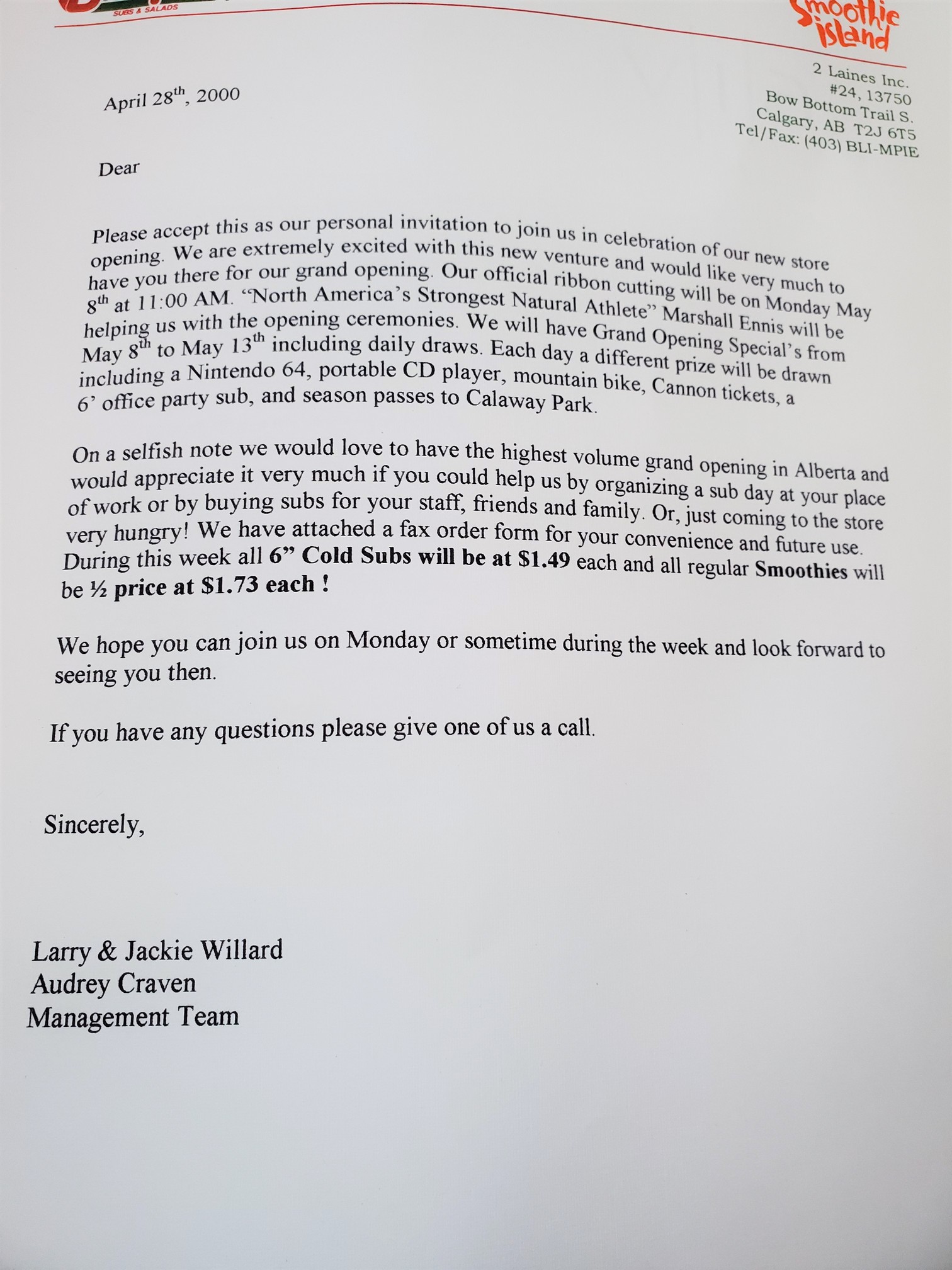 There is a saying be careful what you wish for. For 6 straight days we had people lined up outside the door. The just kept coming. We not only set the record for sales but we almost killed everyone. A hard opening and so busy it was insane. A good thing for relatives as we had all of our staff working, Jackie & I plus Audrey managing and added my sister Darlene that made smoothie after smoothie and food prep. MaryAnn worked the till and prepped and my Mom that dressed up as our company mascot for advertising. In hindsight the opening should have been only 2 or 3 days not the whole week. My idea was to make it a “Try it and keep coming back” marketing approach. All I can say everything we did worked and worked well. Record setting sales, super super busy and not one major hiccup. Very tired after.