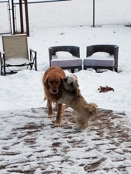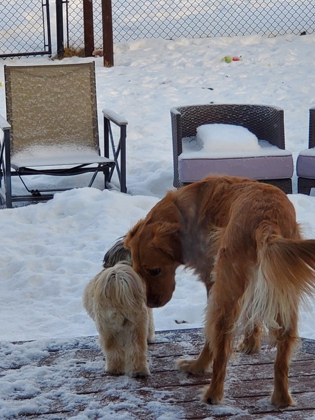 Daisy played with Hazel for a full 1/2 hour outside running around like mad. Hazel is huge and poor little Daisy runs and then get rolled up in a ball as Hazel’s huge paws or head hit her. They have an excellent time playing together. I have to watch as I am fearful of the size difference. Daisy though just keeps going and going. A little sister bugging her big sister. Hazel is very good with her. Daisy will fall asleep as soon as we get home as she will be exhausted.