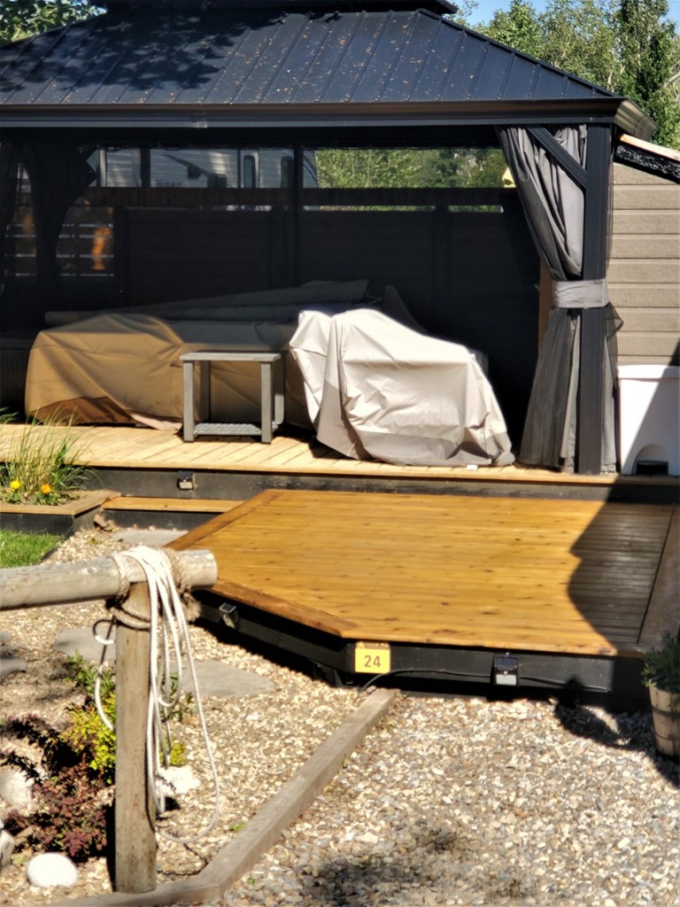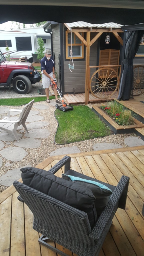Weeding, cutting the grass, dead heading makes the lawn look great. Everything staying decent in the heat. I installed the windows sun shades which help a lot keeping it cooler. I installed the tire covers to keep the UV from causing havoc. I cleaned and placed all of the furniture. Filled the fridge with beer, Diet Pepsi and orange pop plus lots of water. I do have to say cold water on a warm day sure is good. In fact on the way home my gauge read 38 degrees. I was going to stay but I didn’t want Daisy to get to overheated.