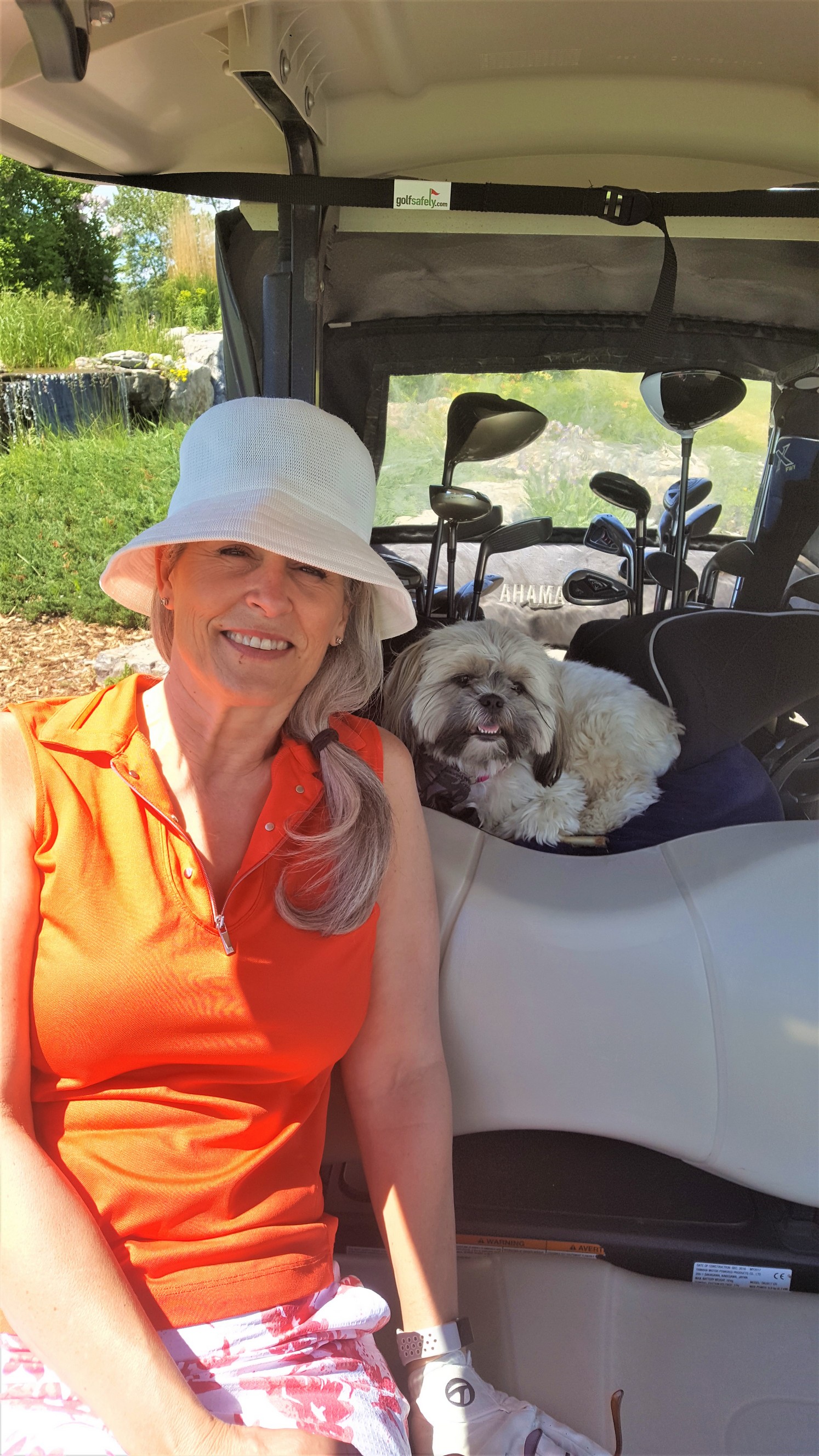 Daisy sits the full 4 hours and enjoys it. She keeps a eye on us when we are on the green. These carts are nice with the club covers as it keeps the sun off her otherwise I angle park.