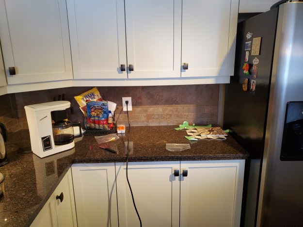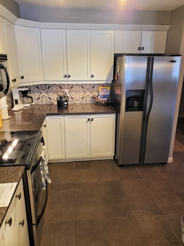 I had enough tiles cut for two plugs and the side of the peninsula so I mixed a batch of thinset and laid these tiles. Wow is this going to look nice ! Wow having such a convoluted pattern is going to waste tiles and drive me nuts ! I really like the look. Italian inspired, country kitchen, modern, chic I can’t describe them other than they look wonderful.
