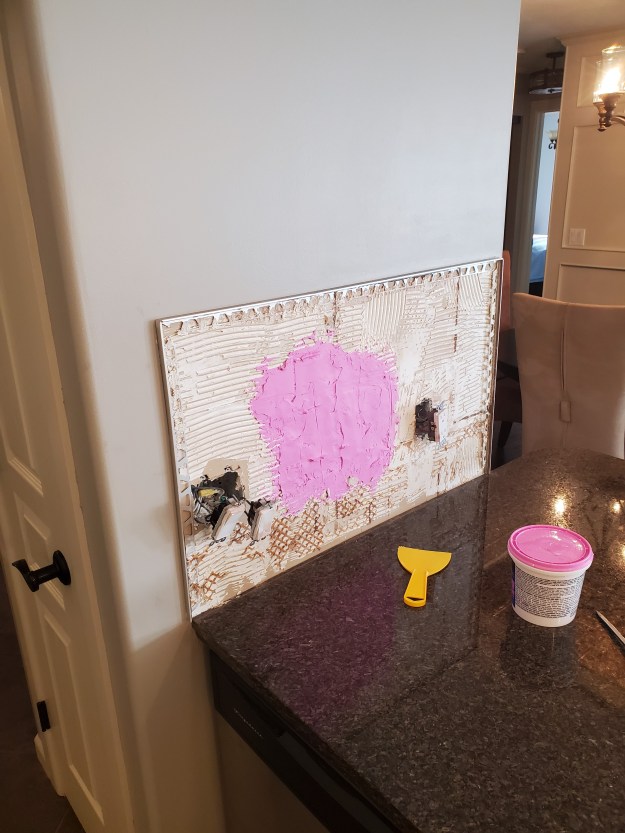 Here is my complaint which I hate to do but I will NEVER use thinset again except if doing a shower. I have used it numerous times and every time the same issues. It is impossible to get every mix correct. It is always too thin or too thick. But the biggest issue is it dries so fast after being applied. With one person it is extremely difficult to apply, lay, and cut. I guess you could make numerous patches but that is a pain. Too thick the tiles don’t stick, too thin they don’t stick, it has no holding power until dry so tiles can slide down and it is messy. Mastic is premixed, don’t have to worry about consistency, is glue tacky so tiles won’t slide and is much easier to work with. It is a lot more expensive. I had to remove 3 ft of thinset as it became to dry to work. I will make sure to remember MASTIC if more tiling happens. Tomorrow will be my test day to check the tiles as thinset tile application can have the pop off affect. The grout will tie the tiles together. If a popped tile a simple application of mastic or small mix of thinset and it is fixed. In hindsight I could have back butter these medium sized tiles which may have worked but with the work time I was dealing with I didn’t. With small tiles it really is not needed.