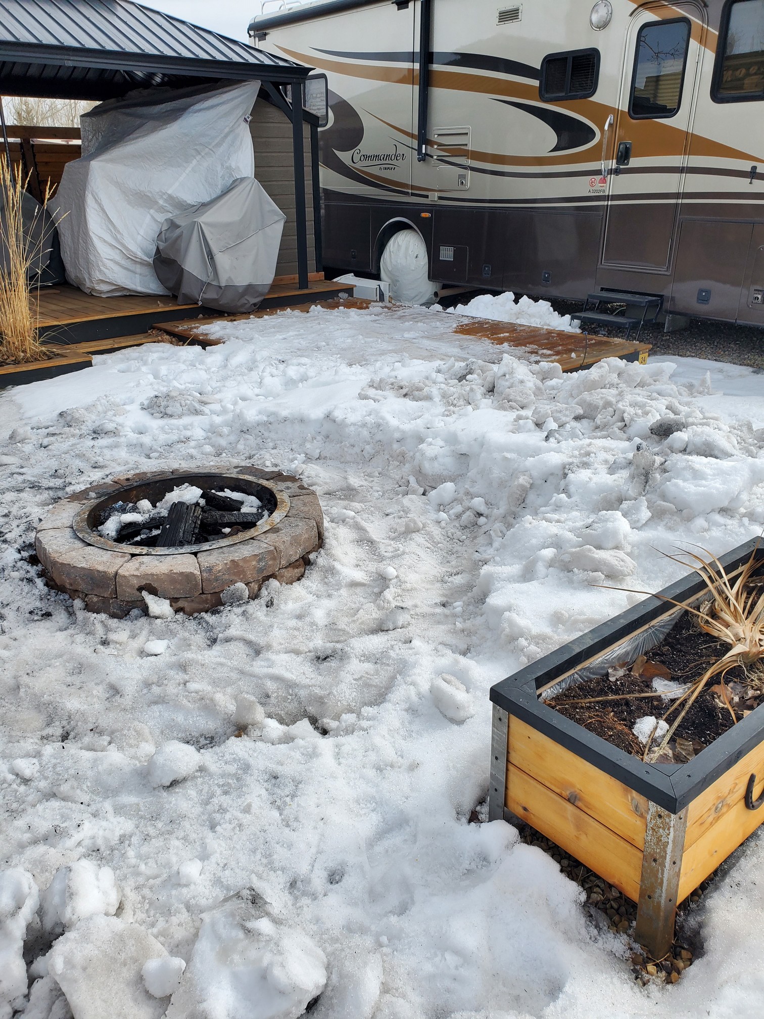 Jackson worked clearing the deck and I dug around the firepit. You would think with the weather we have had in the last few days it would have melted a bit. It was at least 12 inches thick and rock hard ice so I broke it all up in a three foot circumstance around the pit to put our chairs for the weenie roast.