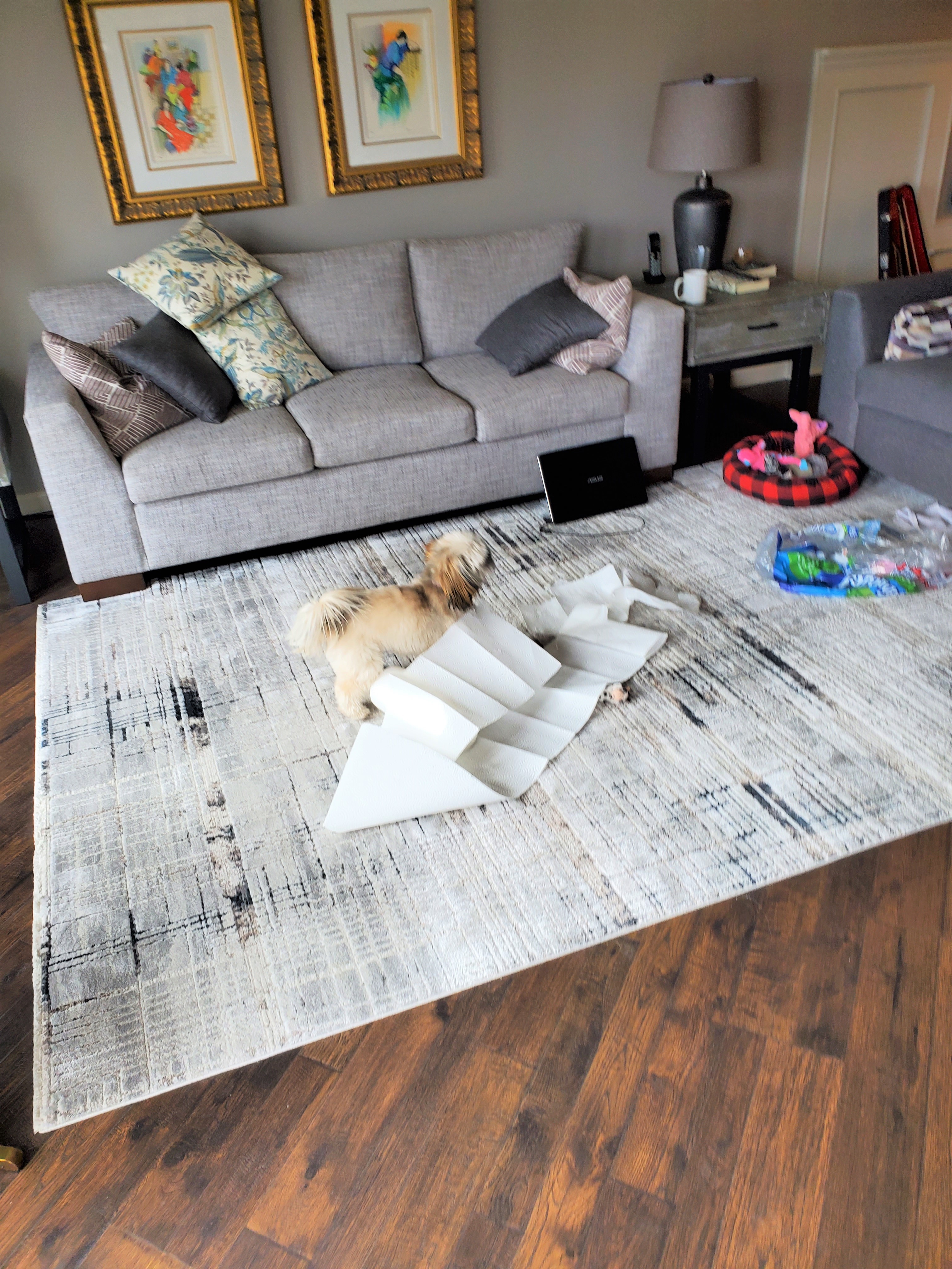 While we were working look who is playing. Daisy grabbed a roll of paper towel and had fun. With grout all over our hands she knew she could get away with it.