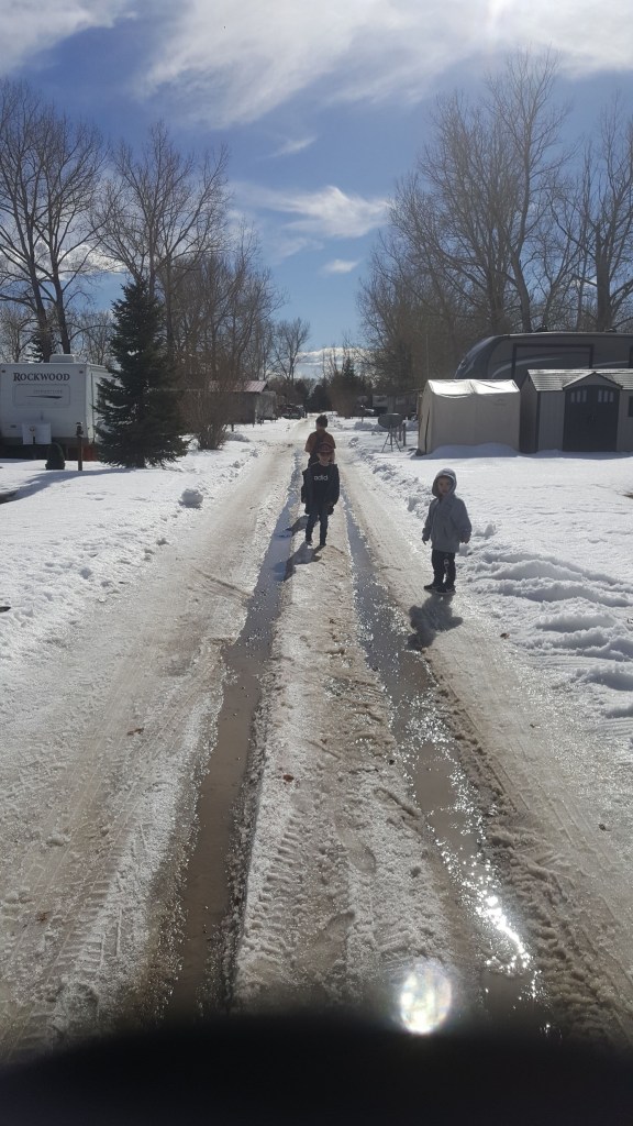 Then off to Oasis to shovel. On the way a funny and weird thing happened. We saw this object in the sky and couldn’t figure out what it was. It was like it kept changing shape. I thought kites at first. Finally we figured it out as it was a flock of Geese practicing flying. As we drove WHAM a huge poop hit our windshield. It scared Jackson and I as it was loud when it hit and was a huge plop.