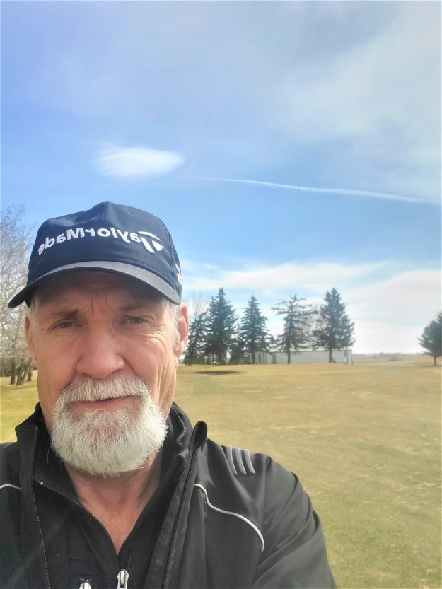 Selfie golfing. I brought everything needed to play in the wind and cold and needed only a toque for a few holes. Just my light summer wind breaker. Should have had my sunglasses on.