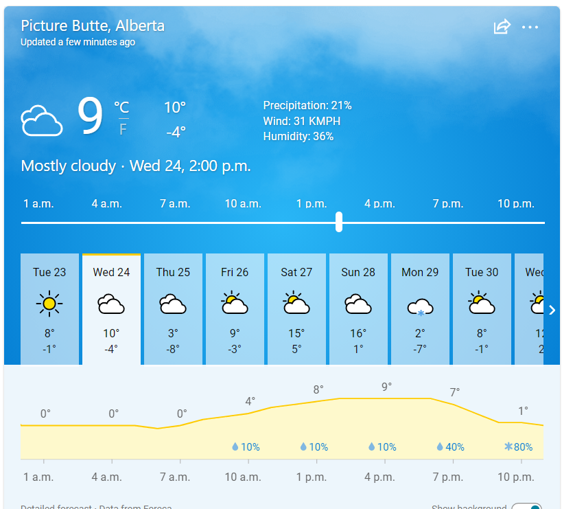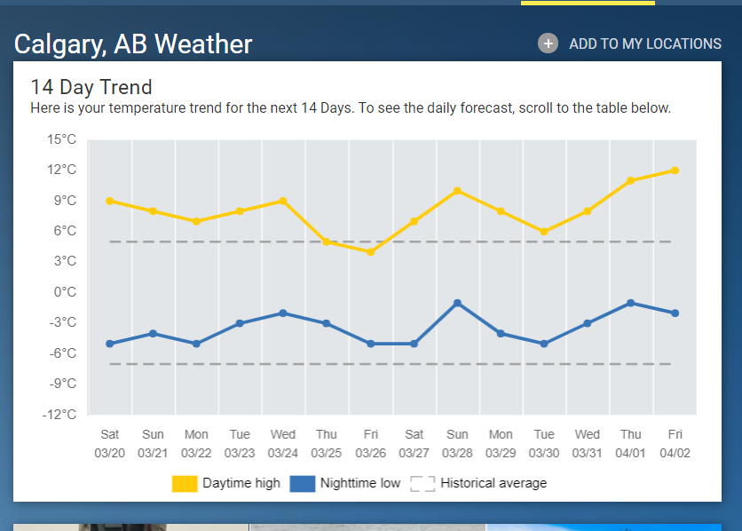 I am golfing tomorrow for the second time this year which I am very happy about. The tee time I booked for 4 people is down to 1 as individuals backed out. I need Keith Harry to live in Calgary. This is spring. It is early spring. We didn’t golf at all this winter. It gets cool and wet or it can get warm that is a risk you take. The weather forecast both on the internet and from the pro shop staff when I talked to them indicate 10 above. That is spring warm.