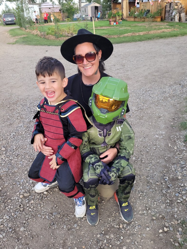 Ralph and Fred are avid Edmonton fans. Fred even buys special TV packages to watch them. It sort of makes sense a bit as Fred is a hunter so the ELK connection is logical. I had my Stamps hat on and we brought a Stamps flag along to help celebrate. Our neighbors beside us just happen to be Riders fans so I needed my flag. Turned out great as when we scored Jackie would run down the street and past our neighbors waving it like made. Pretending she was riding a horse was perfect.