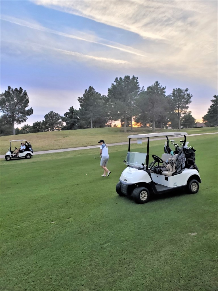 It was Daisy’s first Arizona golf game and she was exceptional. She sat like a Princess for the entire golf game and then stayed in her carrier bag very quiet while we had supper.