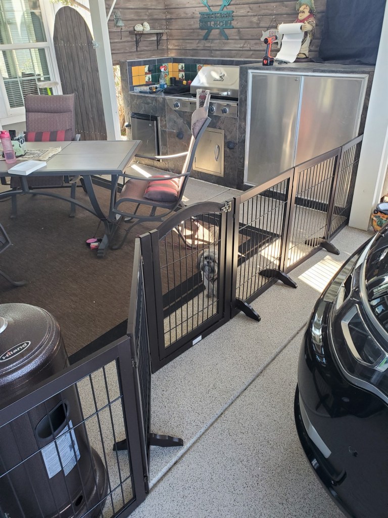 Today was the first day we left Daisy by herself for a few hours. It didn’t go over well as the neighbors said they heard barking quite a bit and when I got home, she was out of her kennel. She ripped the mesh beside the zipper and escaped. She didn’t wreck anything, wasn’t overly stressed but she did need water as it was in her kennel that she could not get back into to drink. We will do a patch job and hopefully test two goes better.