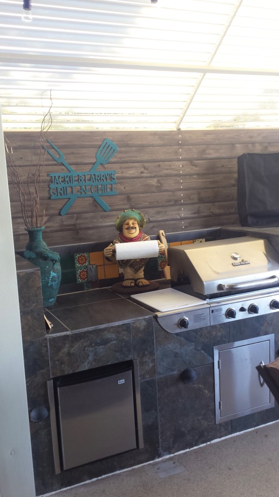 The width was perfect to add a horizontal plank on the bottom of the gate and the height is perfect so Daisy can’t get under it. We also installed one vertical plank between the gutters and the tiled outdoor kitchen to close an opening that Daisy could escape from. We got everything installed and works, plus looks good.