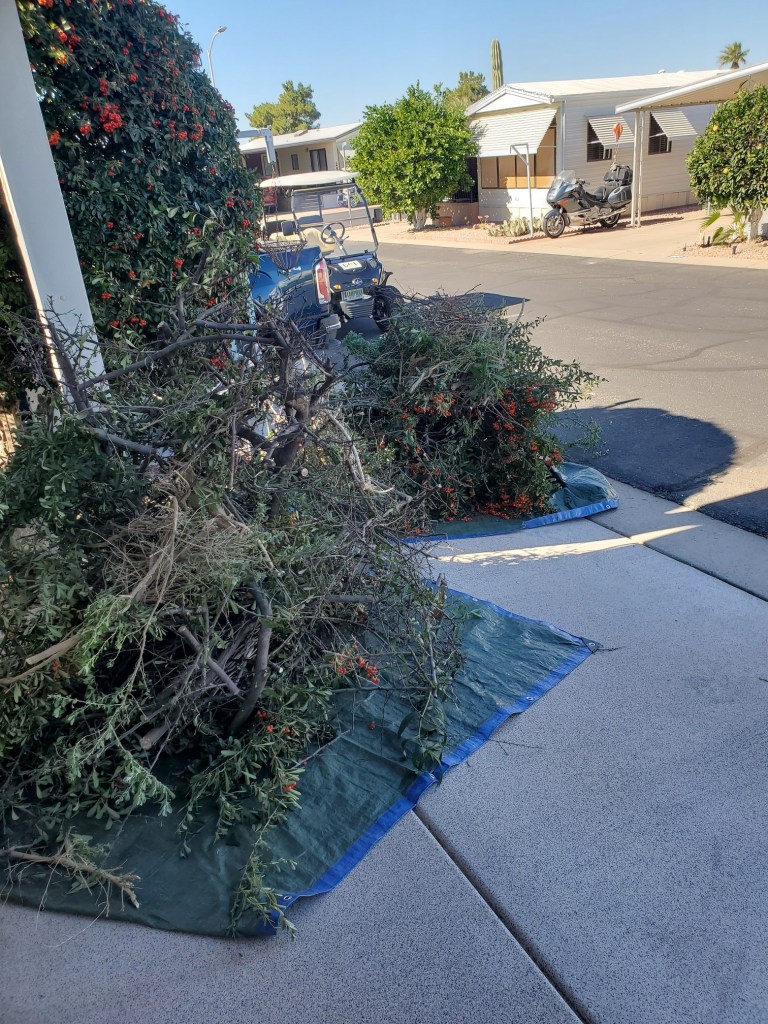 First thing this morning out and at it again. I continued on fixing things up and organizing. I paid to have our trees trimmed and overall a good job but not exactly correct as the trees were hitting our sunscreens and outdoor kitchen area. So I cut trees. I have two loads that we will load into the neighbors truck to take to the dump. Tree cutting is hard work but all done for another year. A good day.
