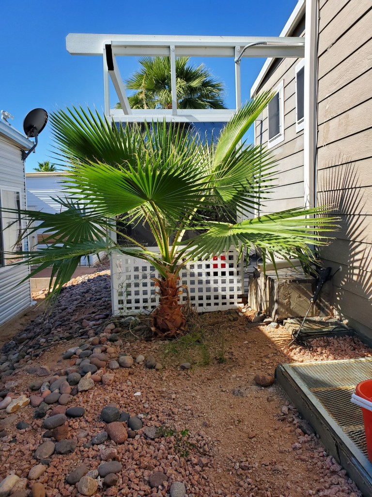 After being away for 20 months look what happened. A new Palm tree made it’s home in our back space. I am going to keep it . It is a relative of Bob Ferris’s tree next door.