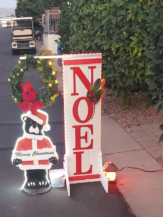 I finished off my Christmas decoration and I love it. Two sided bear and Noel sign look wonderful at night. Unfortunately our block overall is indecisive and we have no coordinated theme like others. Our end of the block has four homes semi alike with Randy, Dwight and Denis along with ourselves being decorated with a red/ white theme a little bit.