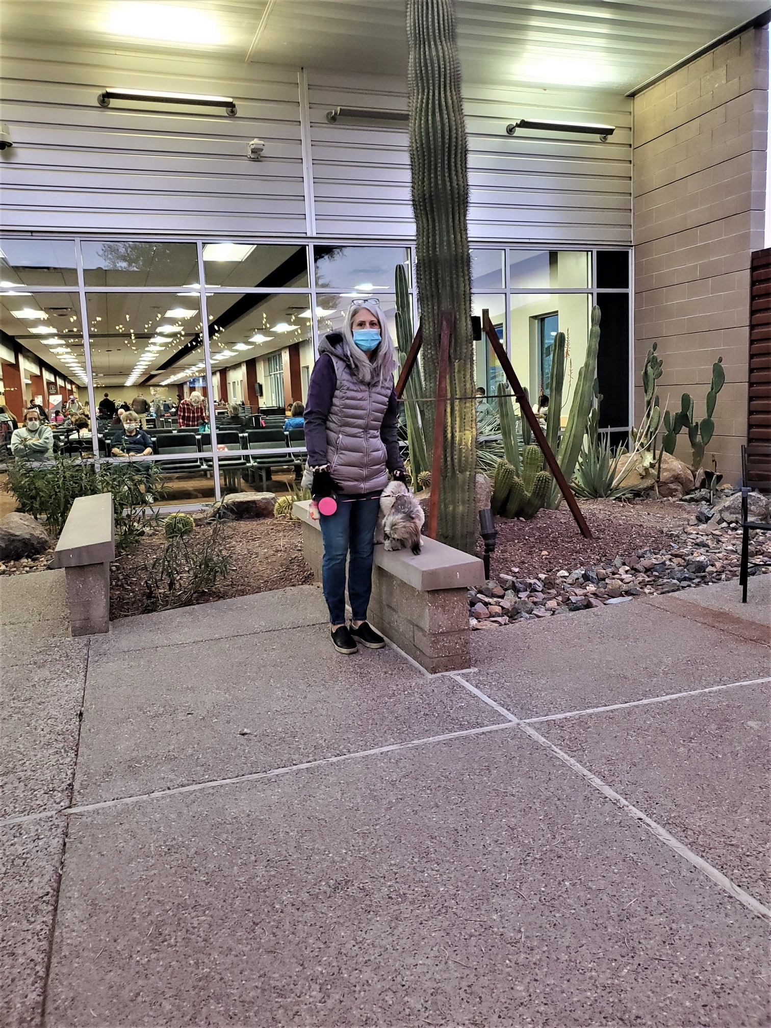 Jackie and Daisy with her new bag that works perfect to carry her into stores and on the plane. Daisy likes to look around and is quite content in it.