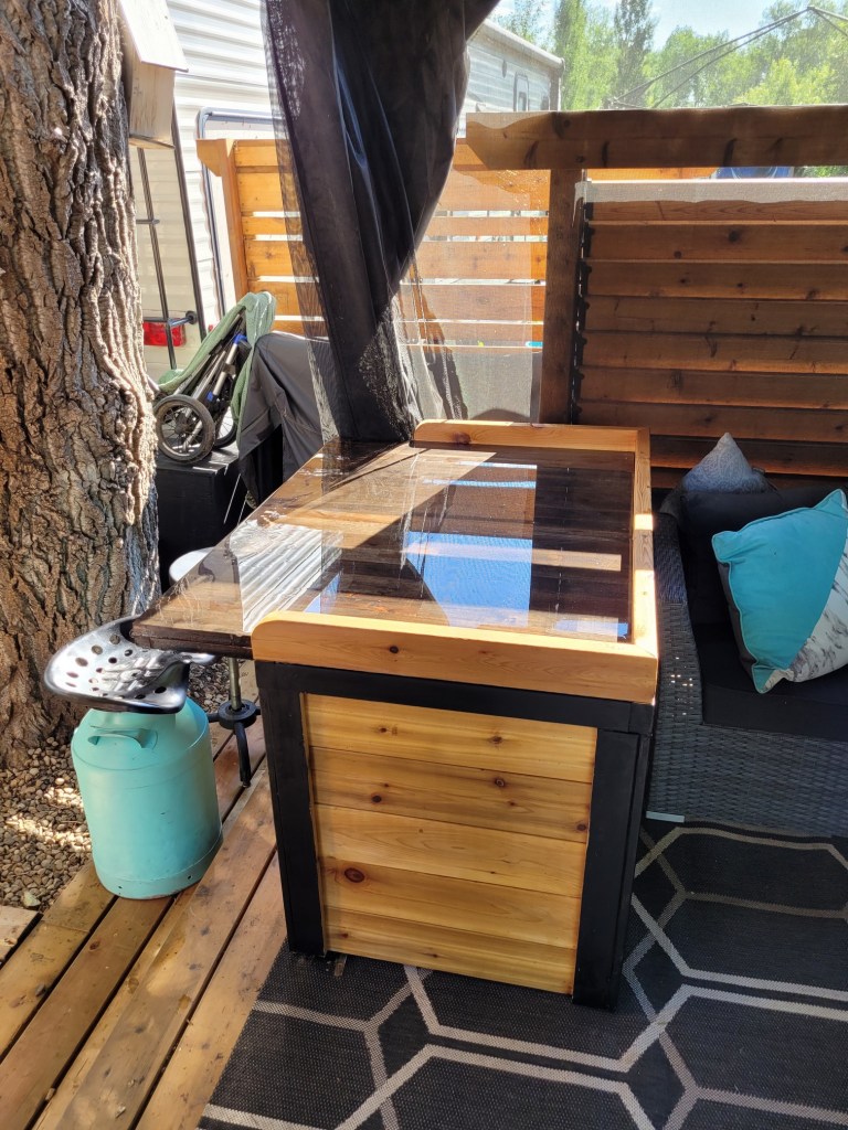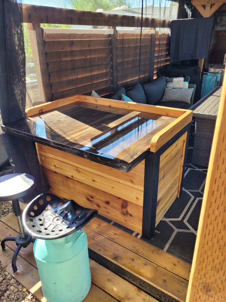 I painted and stained the bar. Unfortunately the stain splashed into my eyes and even today they hurt. After sanding it, I painted the black and then stained the cedar.