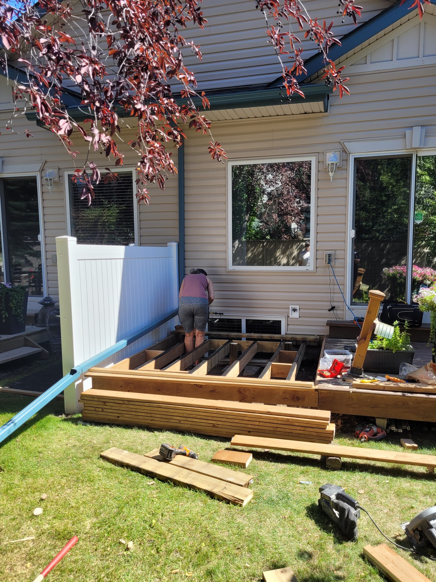 This morning I met Alan at Audrey’s house to work on her deck. After a few changes in design to make it better we came up with a plan. We ripped out the joist and cut off the screws. We were just getting to the point of construction when the battery went dead. Unfortunately no spares so we were out of luck. Our plan is tomorrow start at 9 am. The HOA causes a few design issues with steps and the window well which adds extra time and design issues but I think we have those covered. Hopefully everything goes fine.