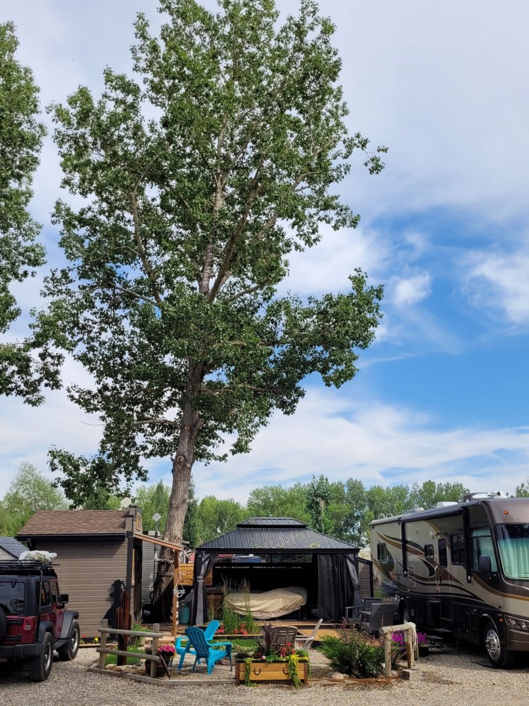 Then the wind started up as the storm up north was to cause major winds in our area. I do not like wind with our big trees we have around us. I just received a quote of $945 to just trim them a bit. I think I am going with that as our deductible is $1000 on the motorhome and it may never be the same if hit.