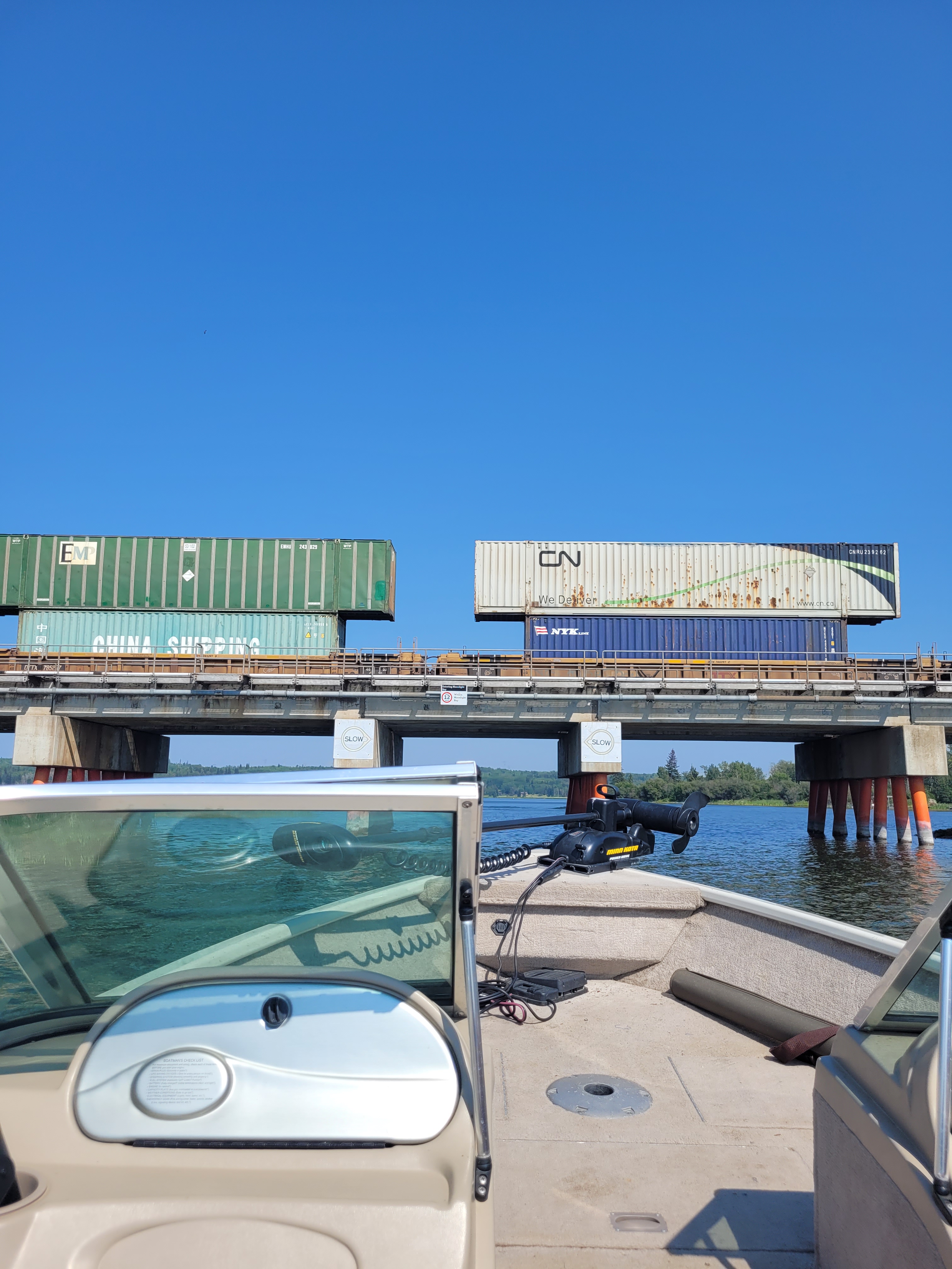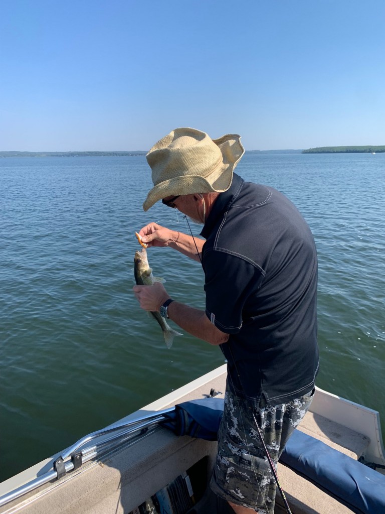 Fishing was a blast. Fred’s boat is wonderful and we can fly across the lake at over 30 mph. The fishing over all was not good. It was spotty, slow and sporadic. Enough fish to keep us interested but not like the 100 we caught last time. All smaller Walleye except for my one small Pike. We both lost a fish but I am sure mine was a huge one that just got away. The lake was like glass, it was hot out and not busy at all so very pleasurable. I loved it. I could have stayed out a couple more hours but timing worked out great for supper etc by coming in when we did. Plus the loading dock wasn’t busy.
