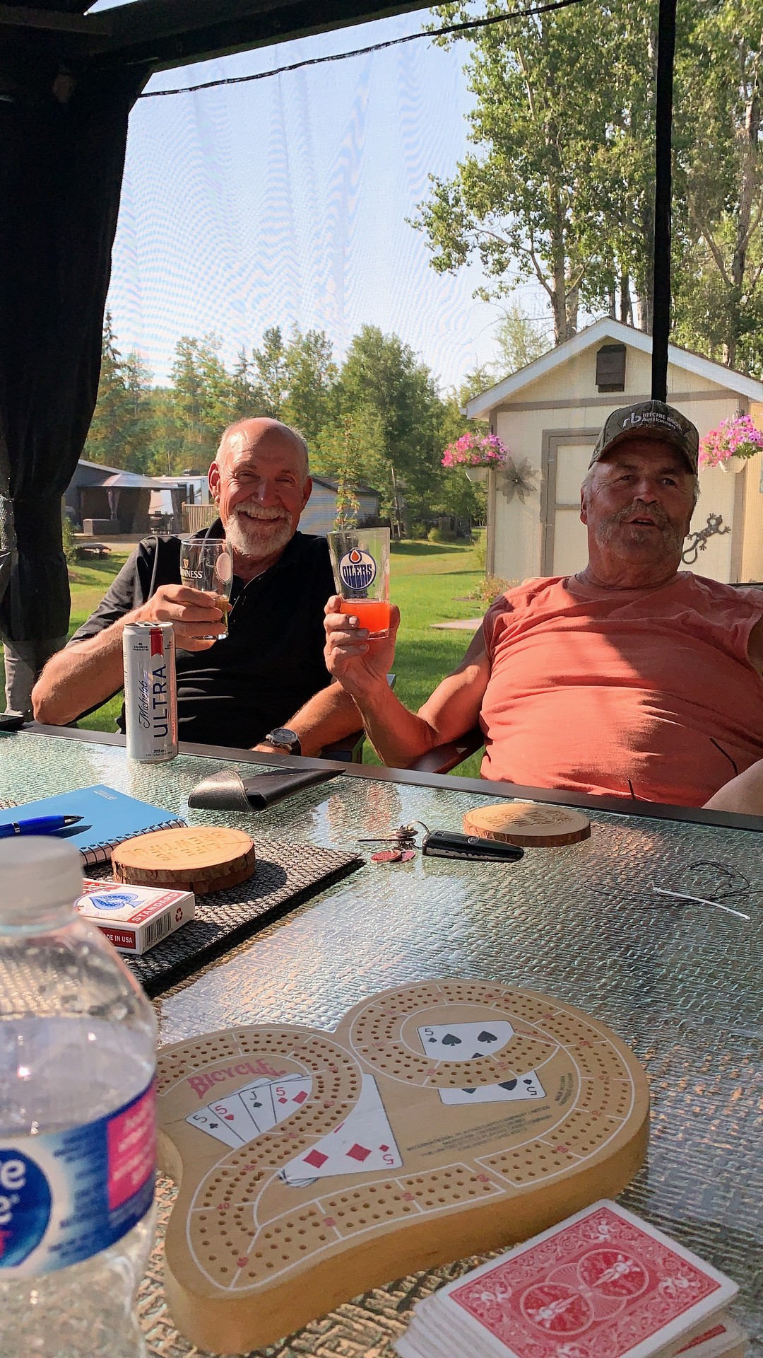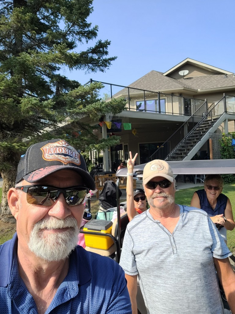 I started off real strong getting a birdie on the first hole and even the front nine with a 41 after taking a couple of three putts. It fell apart a lot in the back for no reason other than 3 putts and mistakes . I ended up with a 89 which I hate. I was fearful of a slice on a tight course and NOT ONE slice. I played quite well but the 7 each 3-putts killed the score. Very impressed with the course. Jeff had some great shots off the tee but struggled with his irons today. All said we had a very fun day ending with a IPA and Caesars on the deck. Another great day in paradise. Well Calgary anyways.