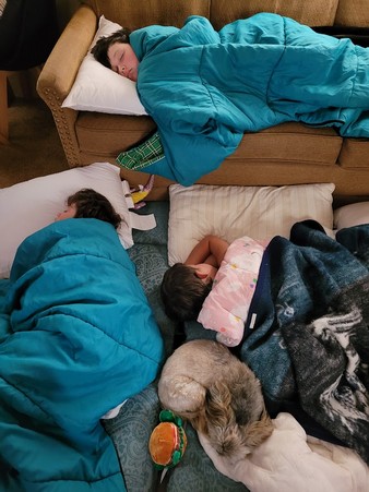 We had some great meals and the kids did vey well. All three kids slept in the living room. On the second night we had storm come up and it was WINDY. We lost at least 10 campers around us as tents and gazebos were being destroyed or blown away. I figured since we had no neighbors I would start the generator and let them watch a movie as we were trapped inside. This worked out great.