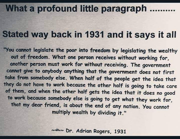 If only people would take a long hard look at this. It is so current with governments today. We have poeple like Bernie Saunders wanting to re-distribute wealth. We have young kids wanting free university. We have the general population wanting free healthcare, grants, CERB, work at home, short work weeks, benefits galore, extra vacation. etc.