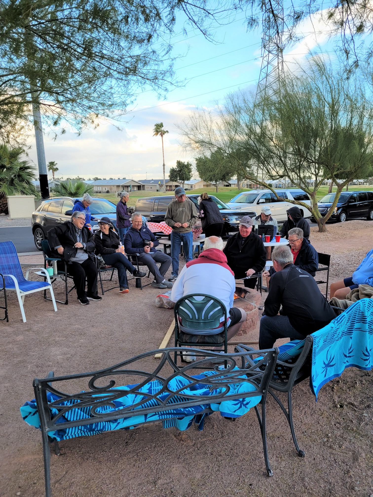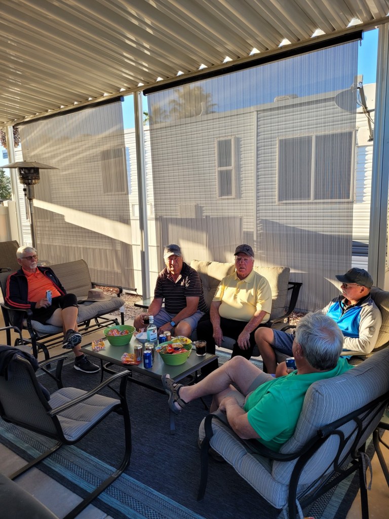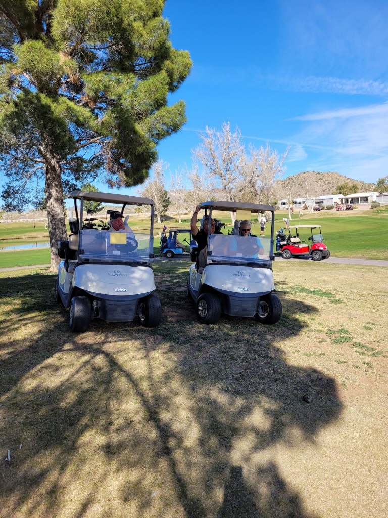Yep, my group waiting in the shade at a hole. This is what golf is like in Arizona. A Palm tree doesn’t provide the same shade and the leaf trees haven’t popped out yet.